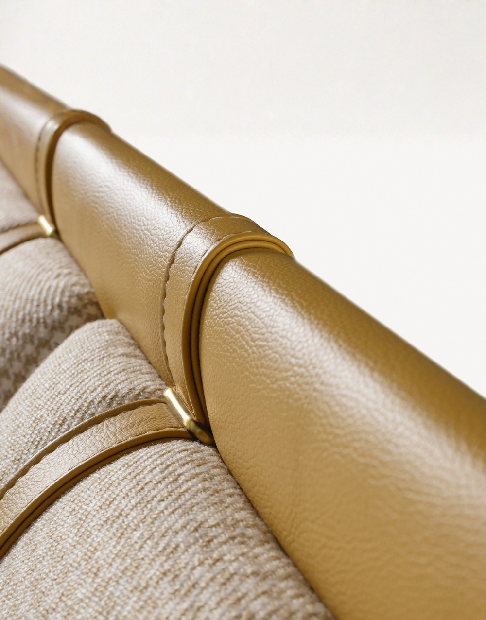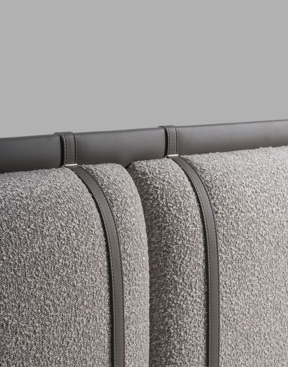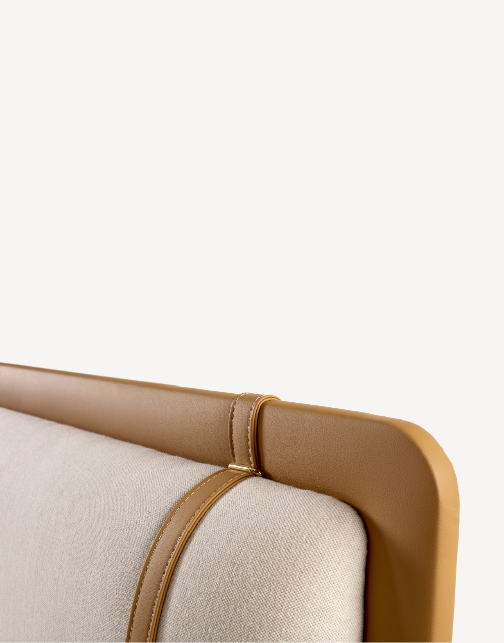 Cabecero tapizado de diseño moderno compuesto por paneles verticales acolchados en textil, delineados con ribetes en cuero natural que aportan estructura y elegancia; su construcción robusta y líneal envolvente brindan soporte visual y un acabado premium ideal para dormitorios contemporáneos.