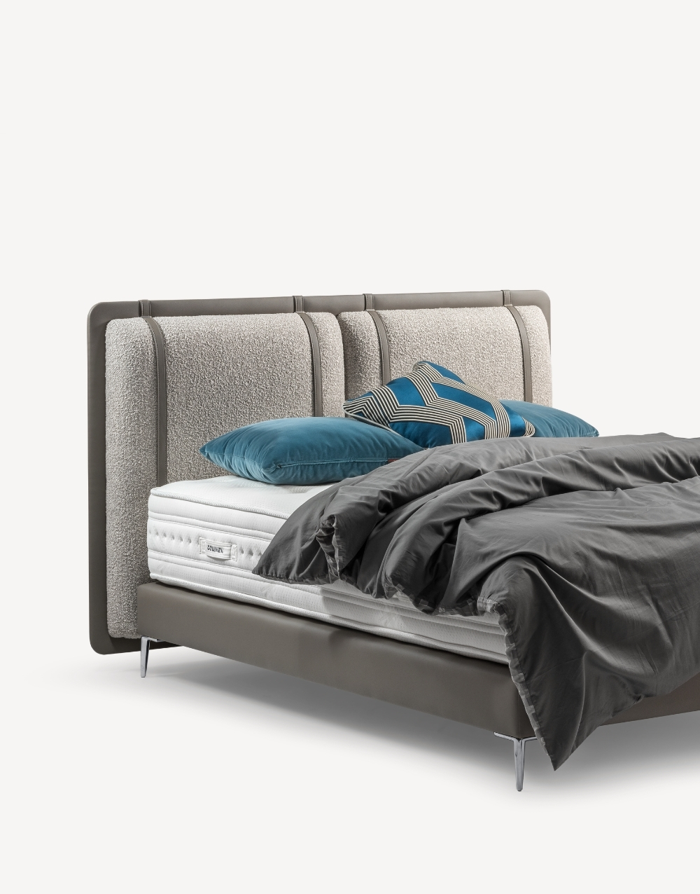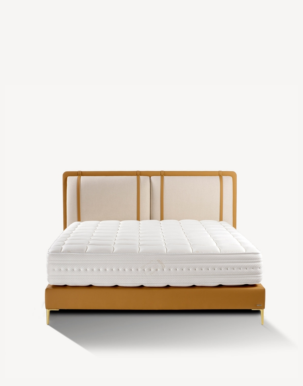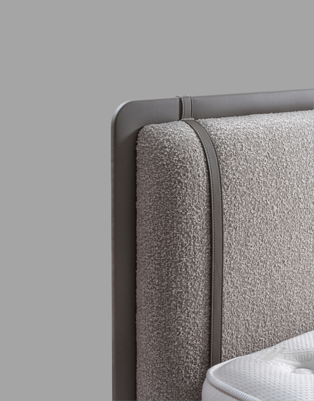 Cabecero tapizado de diseño moderno compuesto por paneles verticales acolchados en textil, delineados con ribetes en cuero natural que aportan estructura y elegancia; su construcción robusta y líneal envolvente brindan soporte visual y un acabado premium ideal para dormitorios contemporáneos.