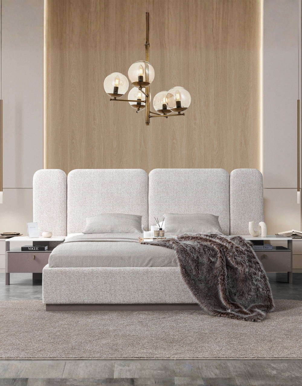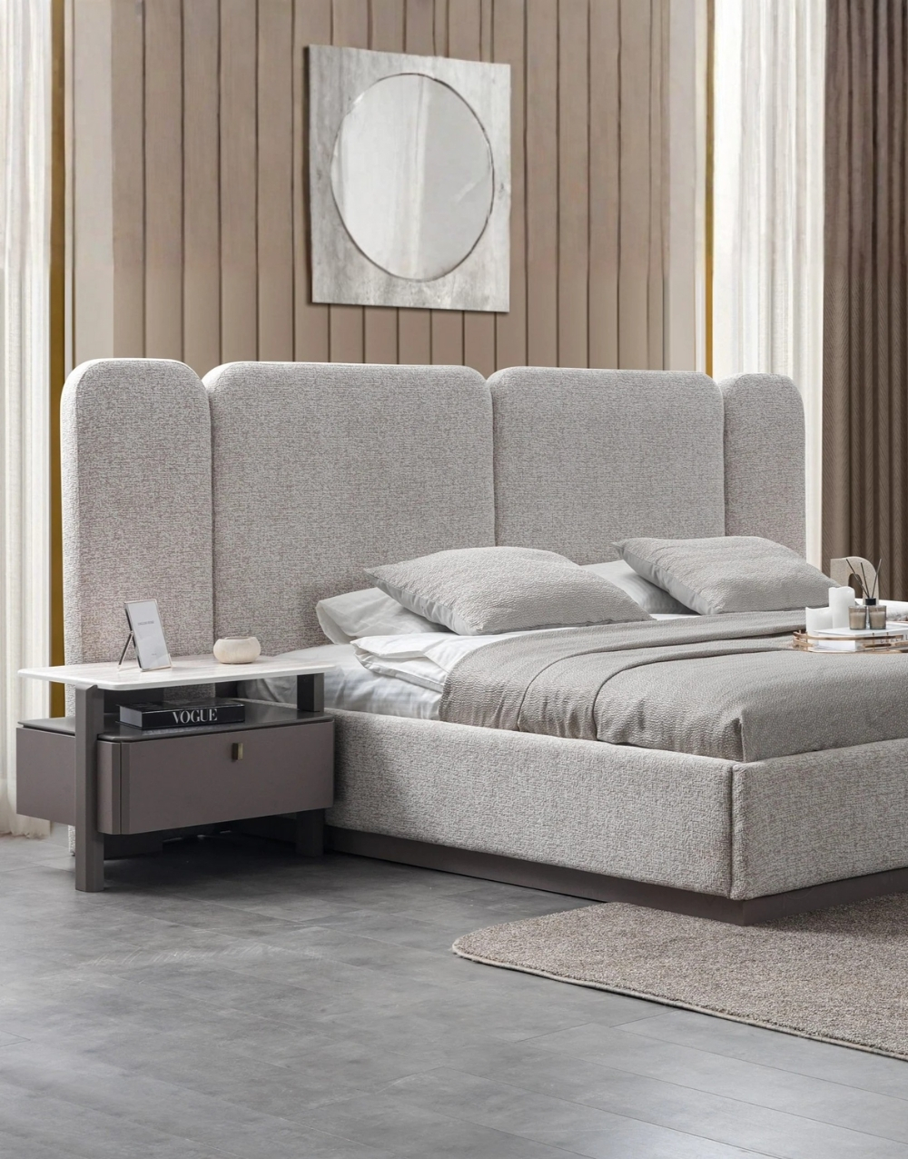 Cabecero modular de diseño contemporáneo compuesto por cuatro paneles acolchados en espuma de alta densidad y tapizados en tela texturizada, todos con esquinas redondeadas para un acabado suave y elegante; su estructura interna en madera maciza garantiza estabilidad, mientras que su formato amplio y simétrico ofrece un soporte visual uniforme y confortable, ideal para dormitorios modernos de líneas limpias.