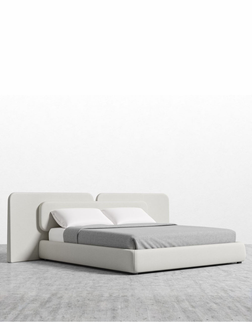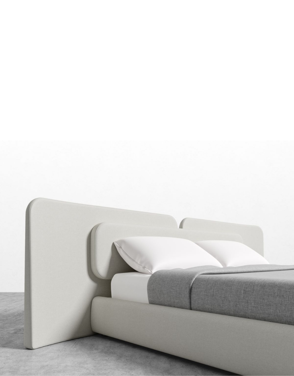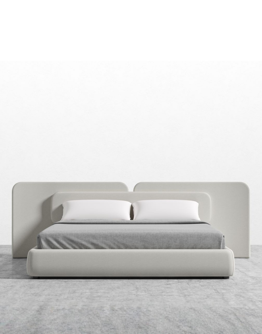 Cabecero modular tapizado con un diseño envolvente y minimalista, formado por 3 paneles amplios de bordes redondeados que se integran visualmente con la estructura acolchada de la cama, creando un conjunto uniforme, suave y contemporáneo que aporta elegancia y comodidad al dormitorio.