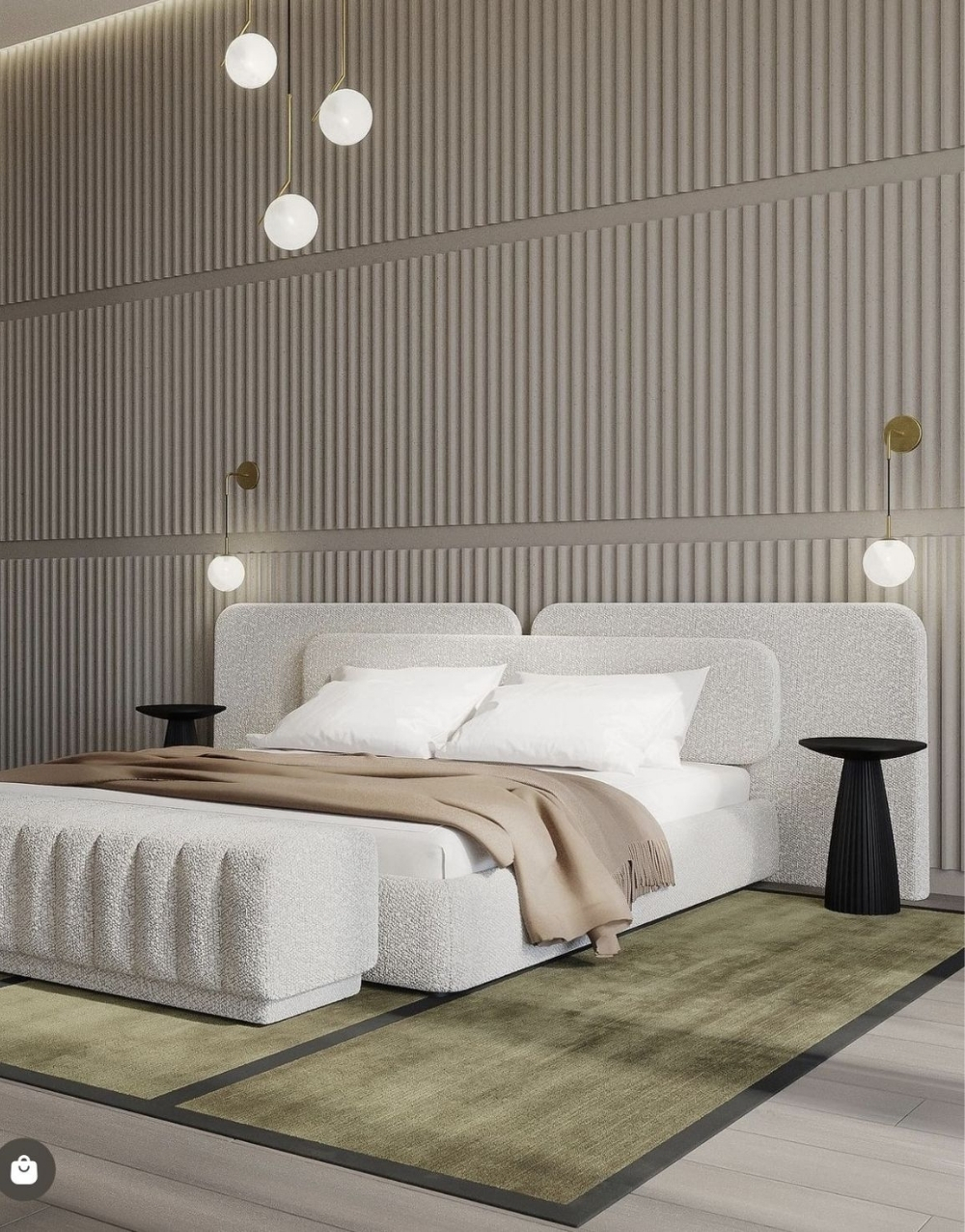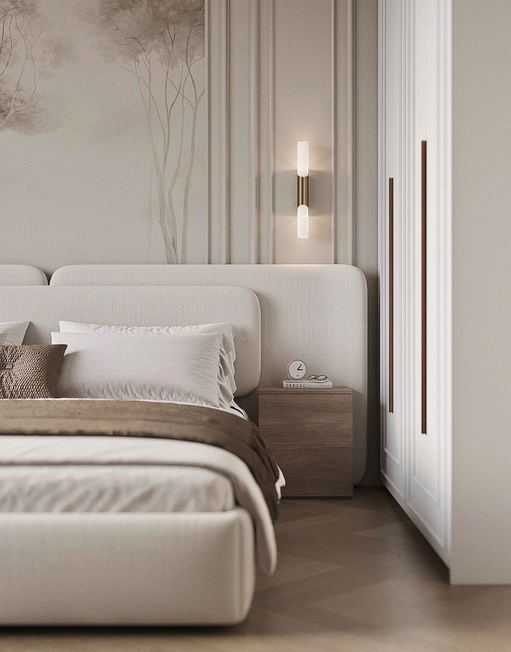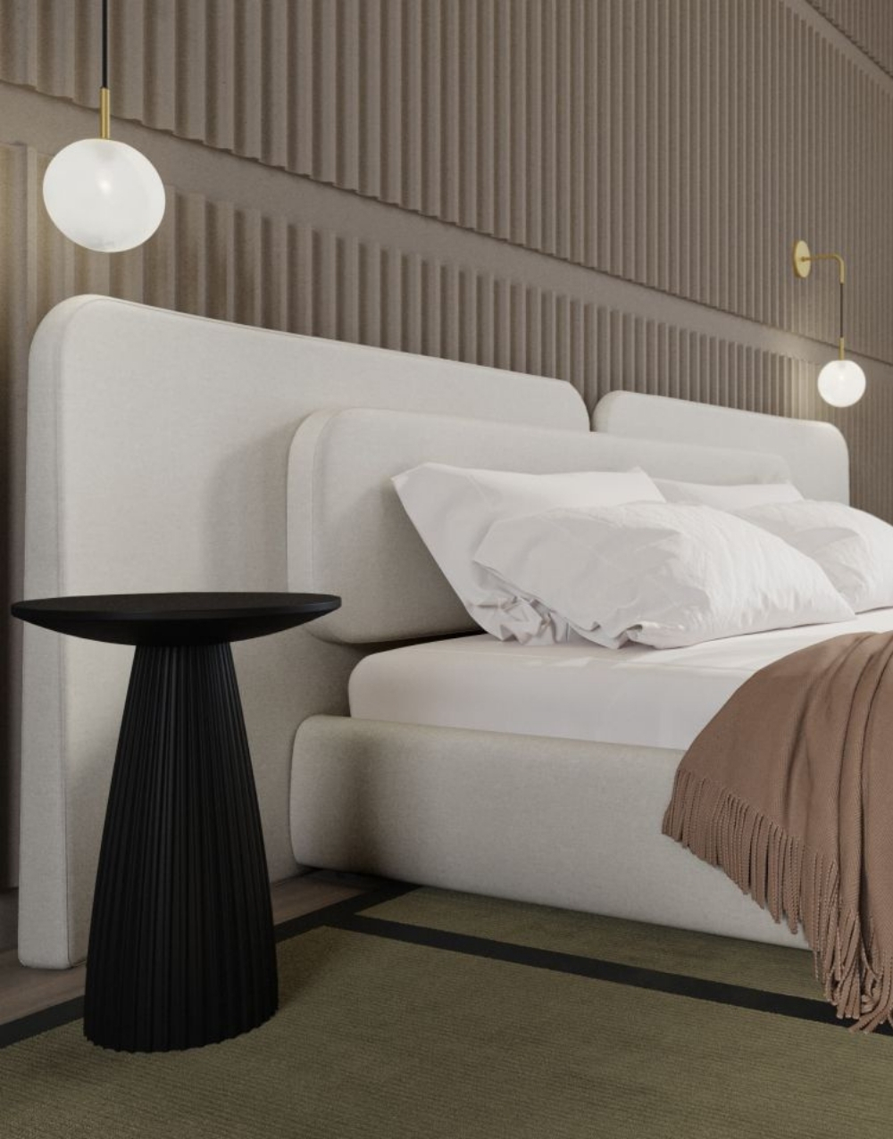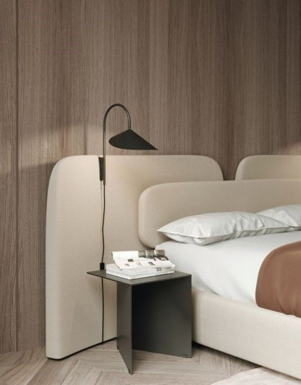 Cabecero modular tapizado con un diseño envolvente y minimalista, formado por 3 paneles amplios de bordes redondeados que se integran visualmente con la estructura acolchada de la cama, creando un conjunto uniforme, suave y contemporáneo que aporta elegancia y comodidad al dormitorio.