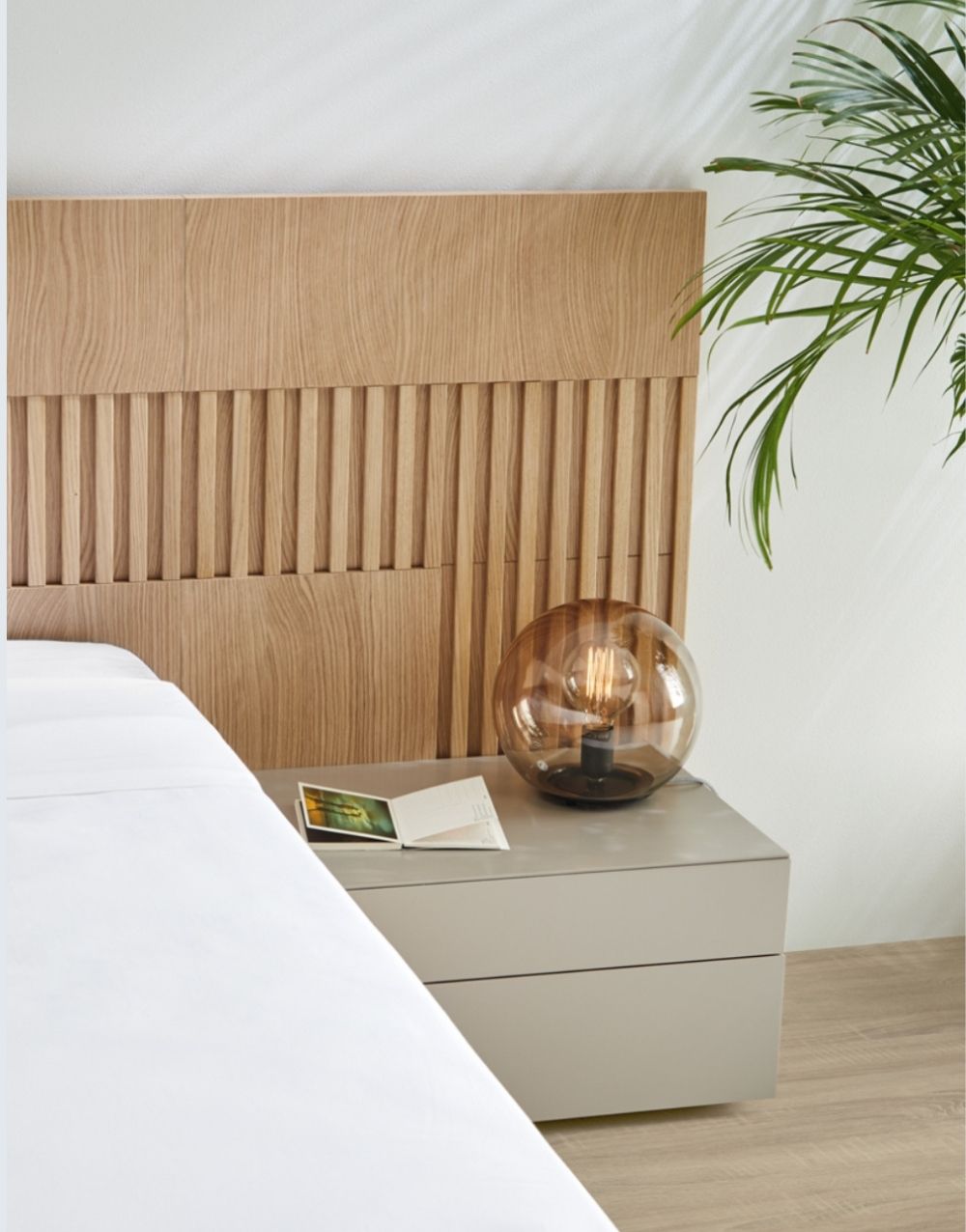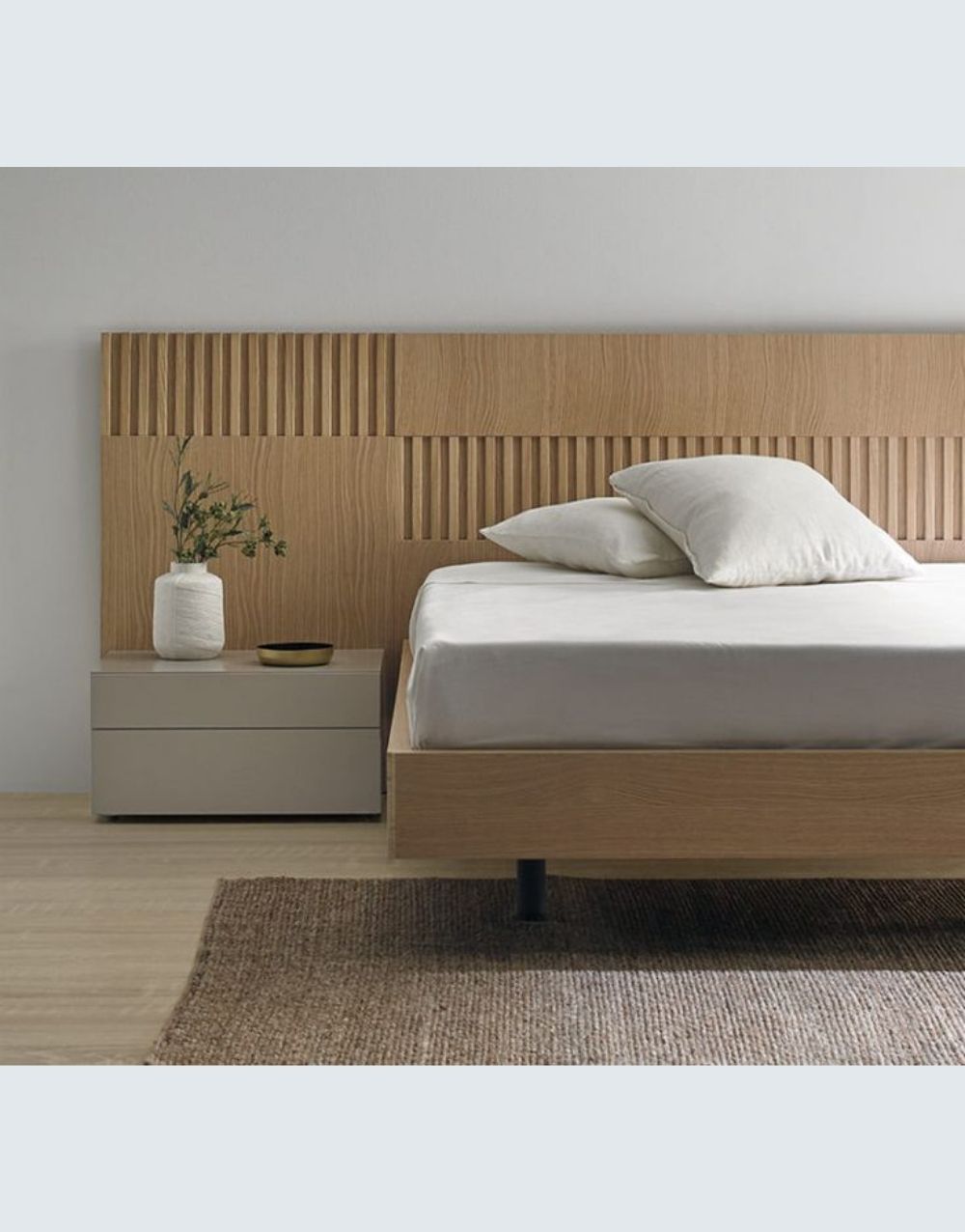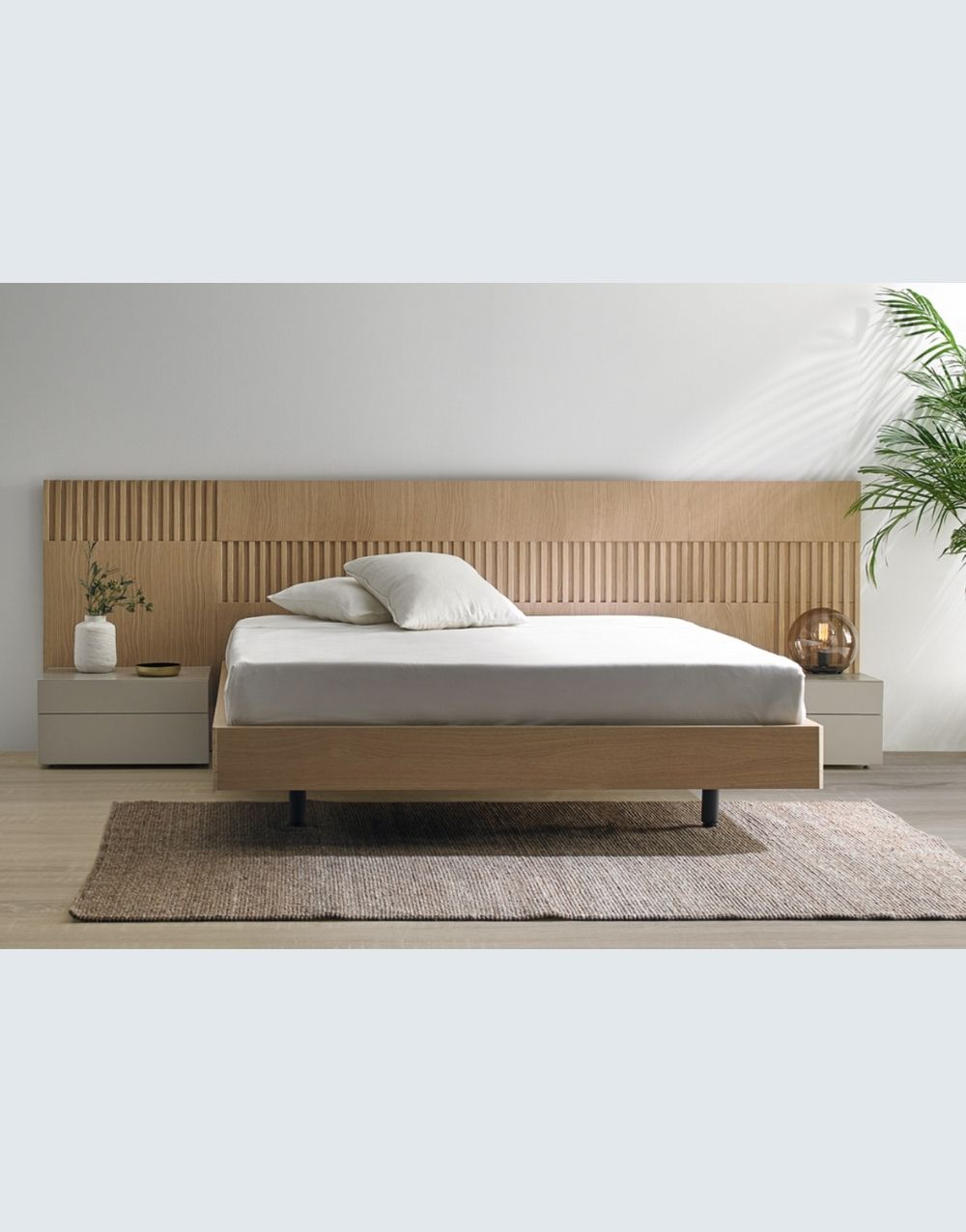 Cama EQUILIBRIO – elegante y cómoda. Esta hermosa cama tiene un cabecero en madera industrializada que le da un aspecto calido y patas metalicas y dos nocheros en madera industrializada, pintadas en laca catalizada.