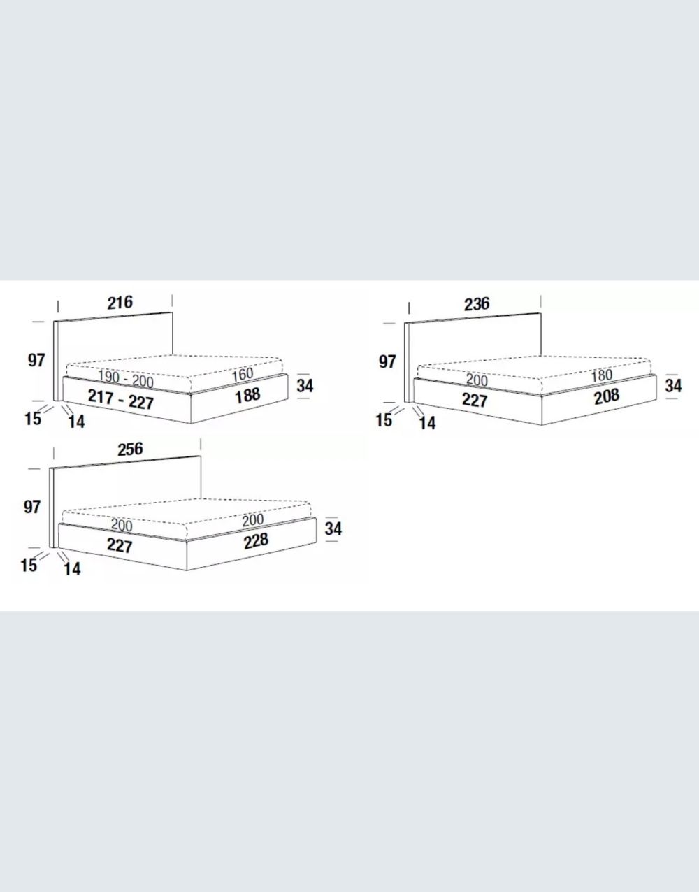 Doble 140 x 190 cms, king 200 x 200 cms, Queen 160 x 190 cms, Semidoble 120 x 190 cms, Sencilla 100 x 190 cms