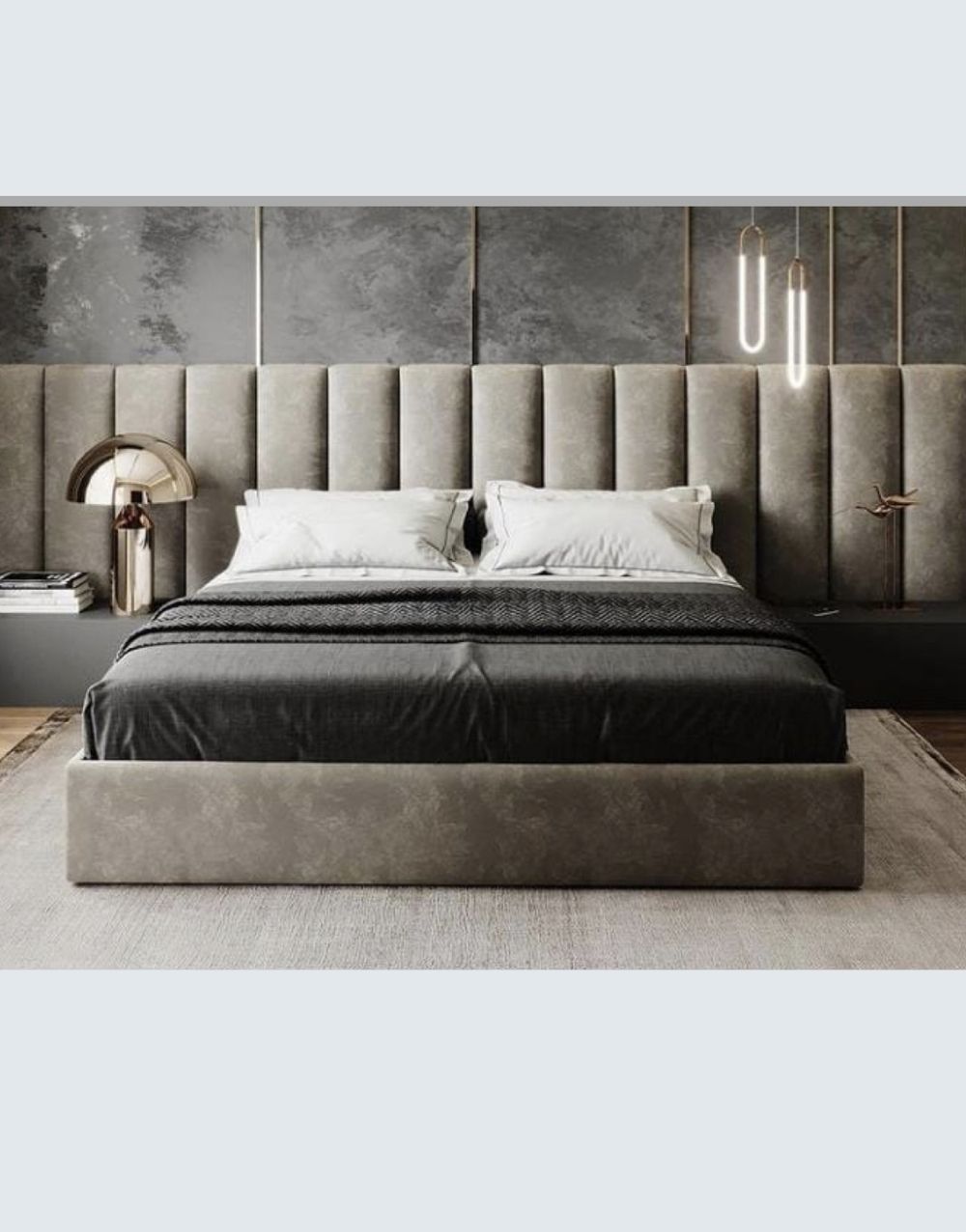 La cama XUXU combina elegancia y comodidad con un cabecero aplatanado, largueros y picero tapizado en tela antifluidos. Incluye dos nocheros fabricados en madera maciza industrializada pintadas en laca catalizada, creando un conjunto armonioso y funcional para tu dormitorio.