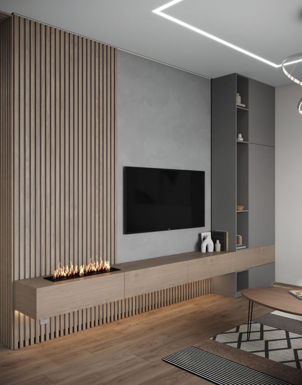 Este centro de entretenimiento de estilo minimalista se adapta perfectamente a tus espacios, ofreciendo una amplia variedad de espacios de almacenamiento interior y exterior con entrepaños y cajones en madera melaminica. Además, cuenta con listones en madera maciza y luz led en la parte inferior para añadir calidez y elegancia a tu hogar.