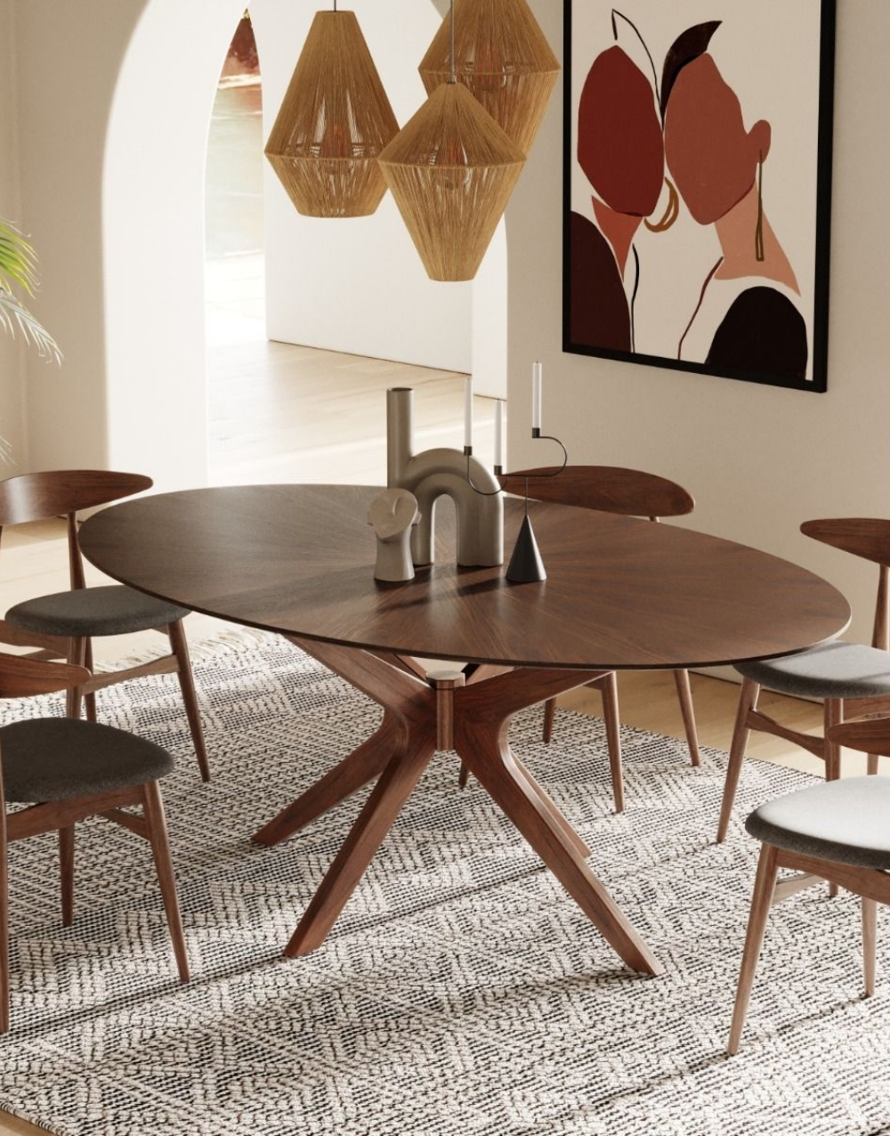 La Mesa de Comedor ANGYE combina elegancia y funcionalidad con un diseno atemporal. Su tablero redondeado, con borde inclinado, esta elaborado en madera maciza de flor morado, realzando su calidez y sofisticacion. La estructura de marco delgado y las patas del mismo material garantizan estabilidad y resitencia, logrando un equilibrio perfecto entre estetica y durabilidad. Ideal para interiores de inspiracion Danesa e italiana,ANGYE es sinonimo de distincion y calidad.