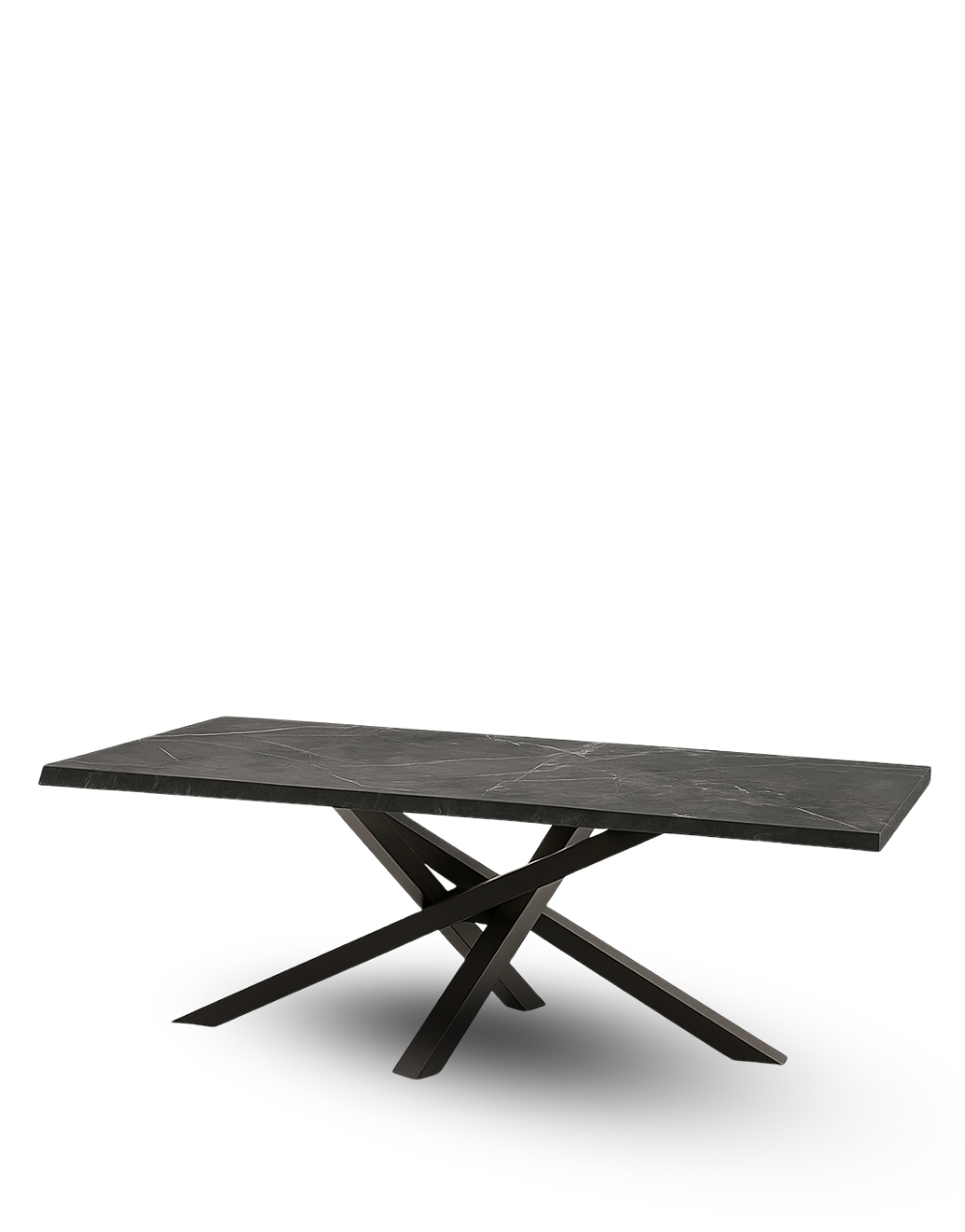 ARGELIA representa una mesa de comedor versátil, destacada por su diseño industrial. Sus patas entrelazadas de aspa, fabricadas en metal cold rolled recubierto de pintura electroestática negro mate microtexturizado, armonizan con el tablero superior de Piedra Sinterizada. Ideal para ambientes de Lujo.