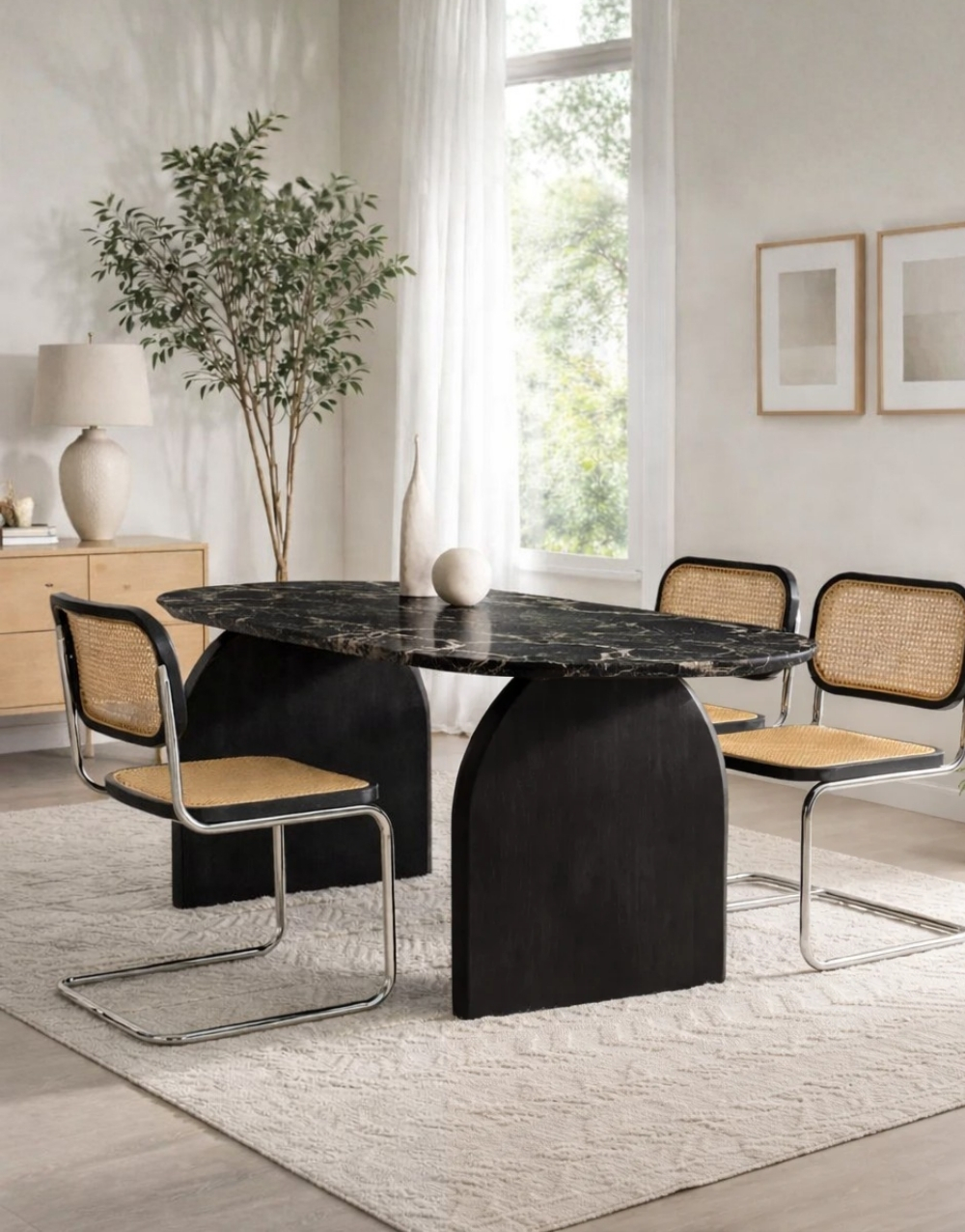 THEO es un comedor versátil, diseñado para adaptarse a diversos estilos de hogar que buscan crear un ambiente cálido y armonioso. La mesa destaca por su tapa y patas, que presentan una forma elegante y que están elaboradas en madera maciza, Flor Morado, un material conocido por su belleza y su tablero en Piedra sinterizada. El diseño simple y cuidadosamente elaborado de THEO aporta un toque moderno y fresco a cualquier espacio. Su singularidad y calidad lo convierten en una pieza distintiva para complementar el comedor con estilo y personalidad.