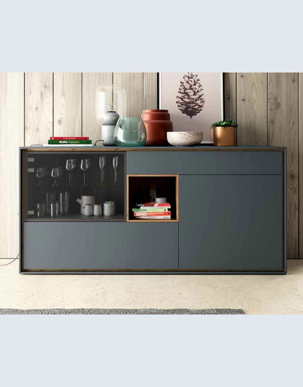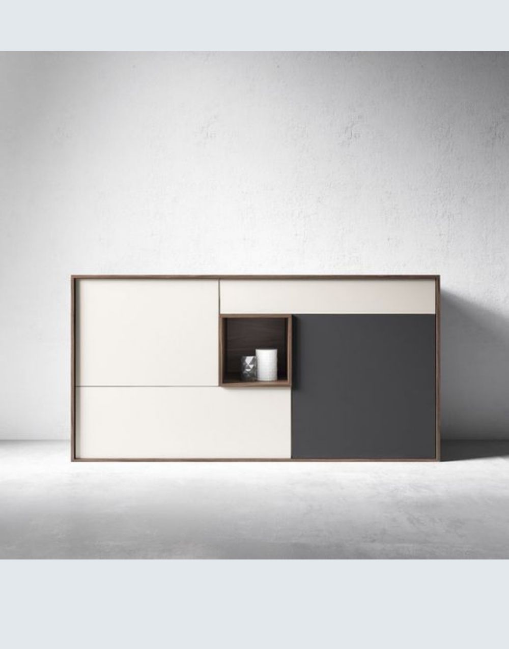 La cómoda FEDORA es una pieza de mobiliario elegante y atemporal que incorpora un diseño sofisticado.Cuenta con dos cajones y dos puertas, las cuales presentan un moderno sistema push, y su refinado acabado se compone de una armoniosa combinación de colores . En el centro, se destaca una exposición de madera de nogal, aportando un toque cálido y distintivo a esta atractiva cómoda.