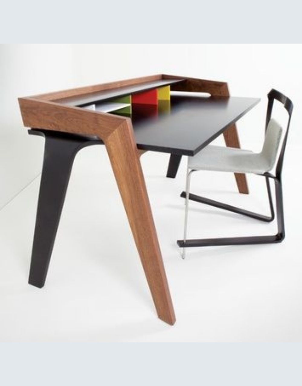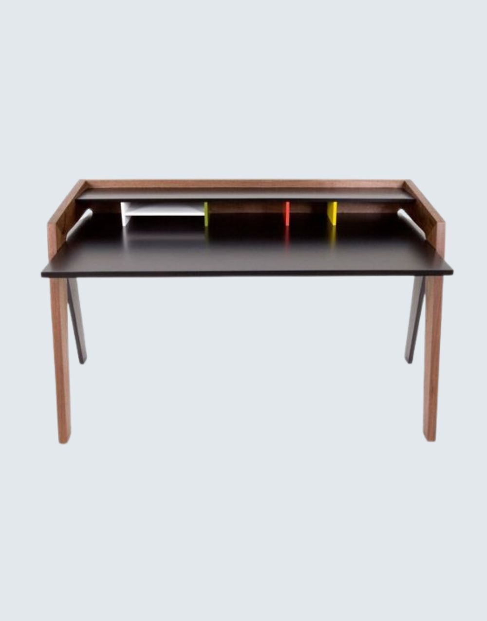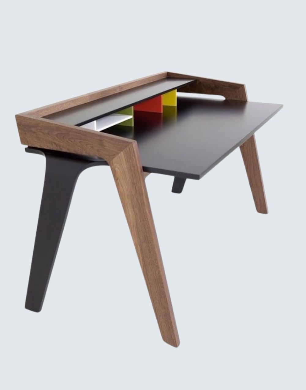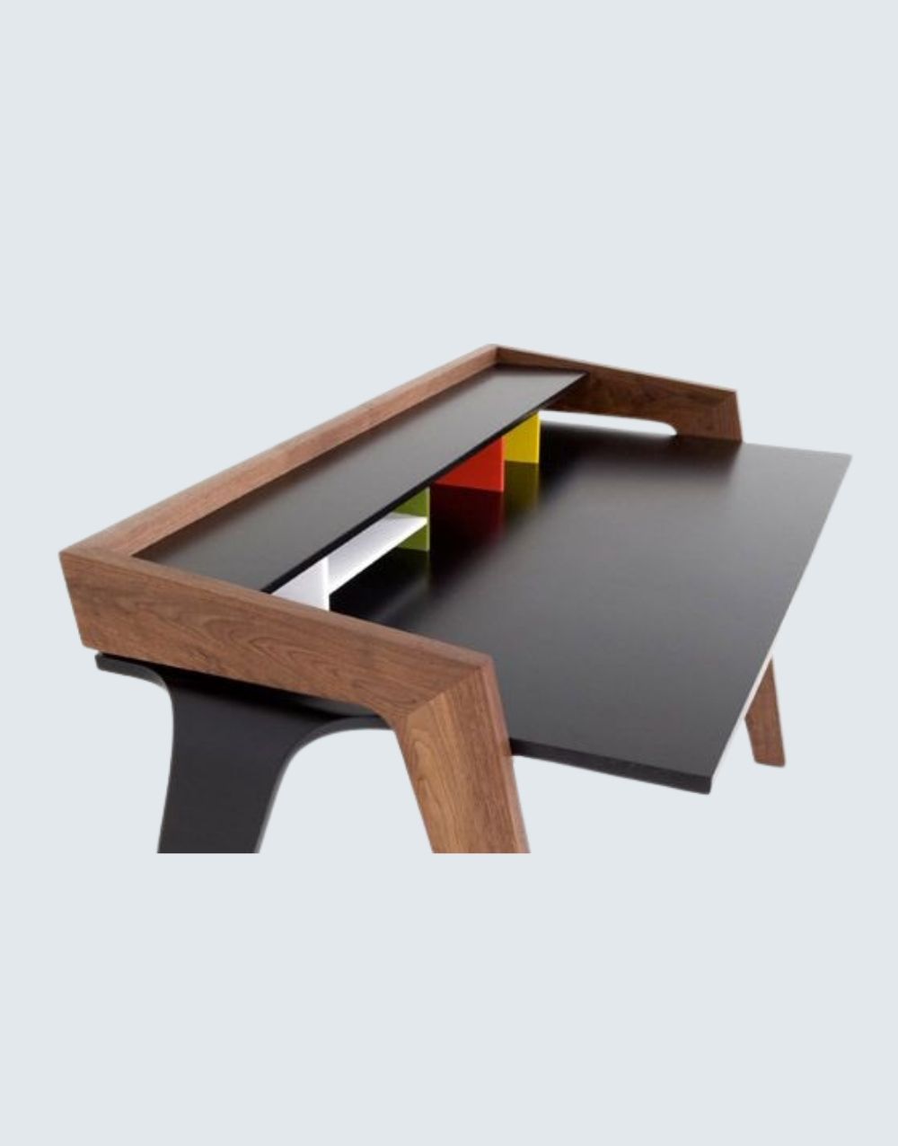 El escritorio CANTER combina diseño clásico y funcionalidad contemporánea. Con una estructura de madera industrializada recubierta de poliuretano negro, ofrece durabilidad y elegancia. Dispone de entrepaños adaptables y patas personalizables en madera maciza flor morado.