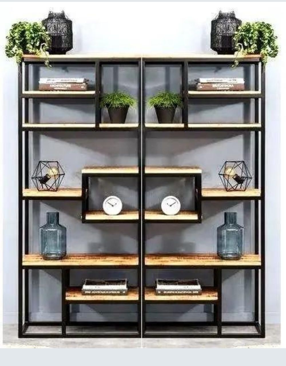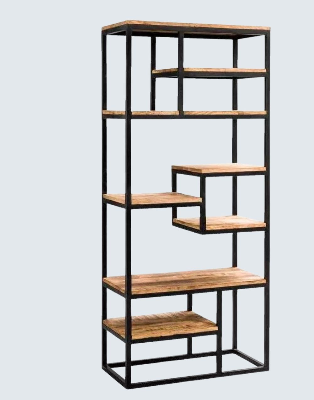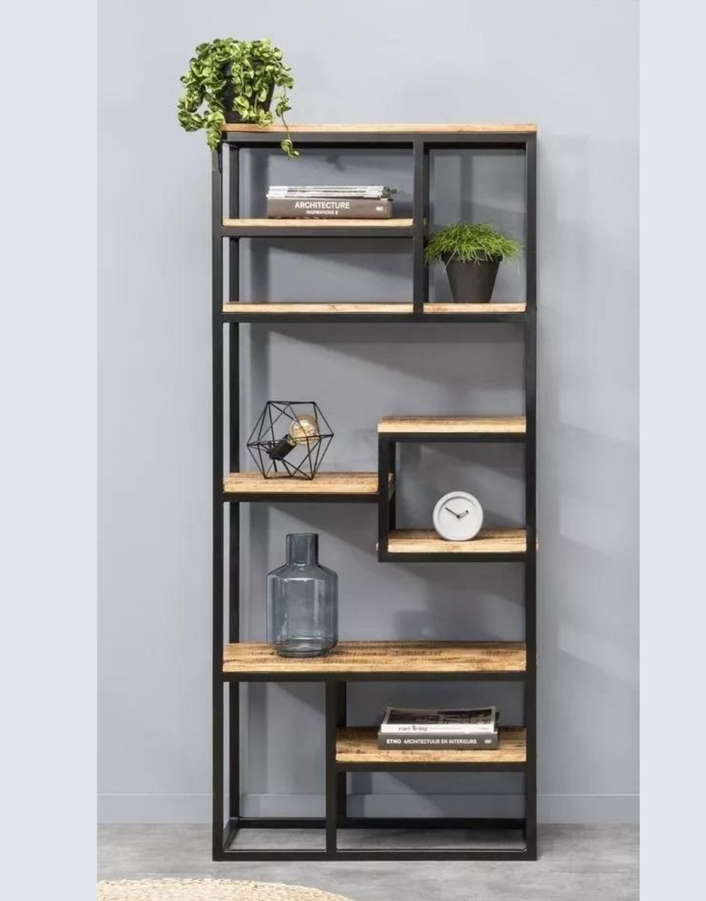 Esta estantería horizontal ofrece una versatilidad excepcional con entrepaños , destacando su agilidad en el diseño y funcionalidad. Perfecta como separador virtual de espacios, combina metal cold rolled pintado en electrostática negro mate con entrepaños de madera maciza flor morado.