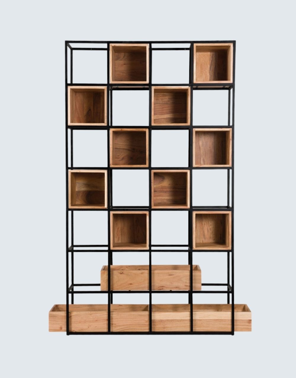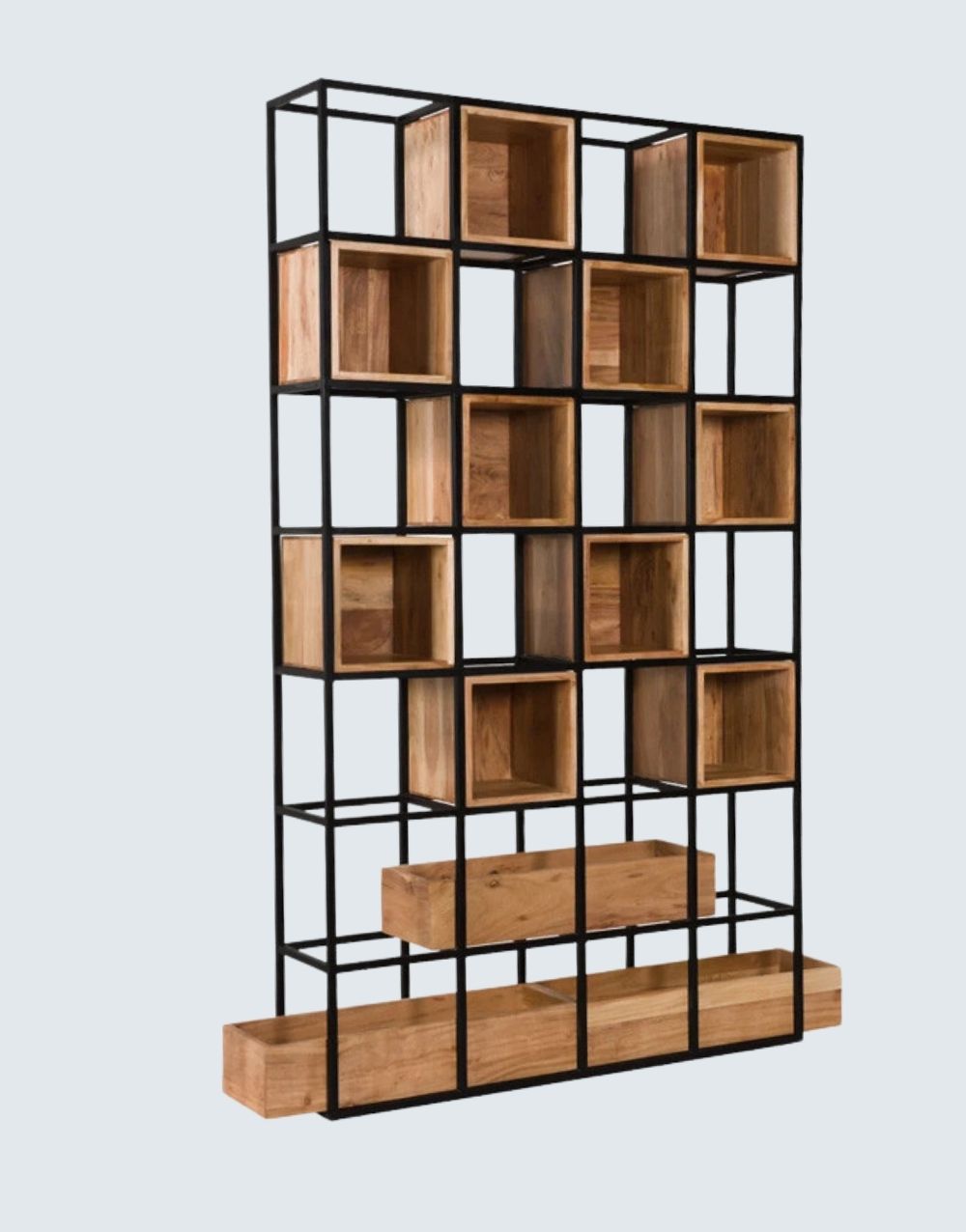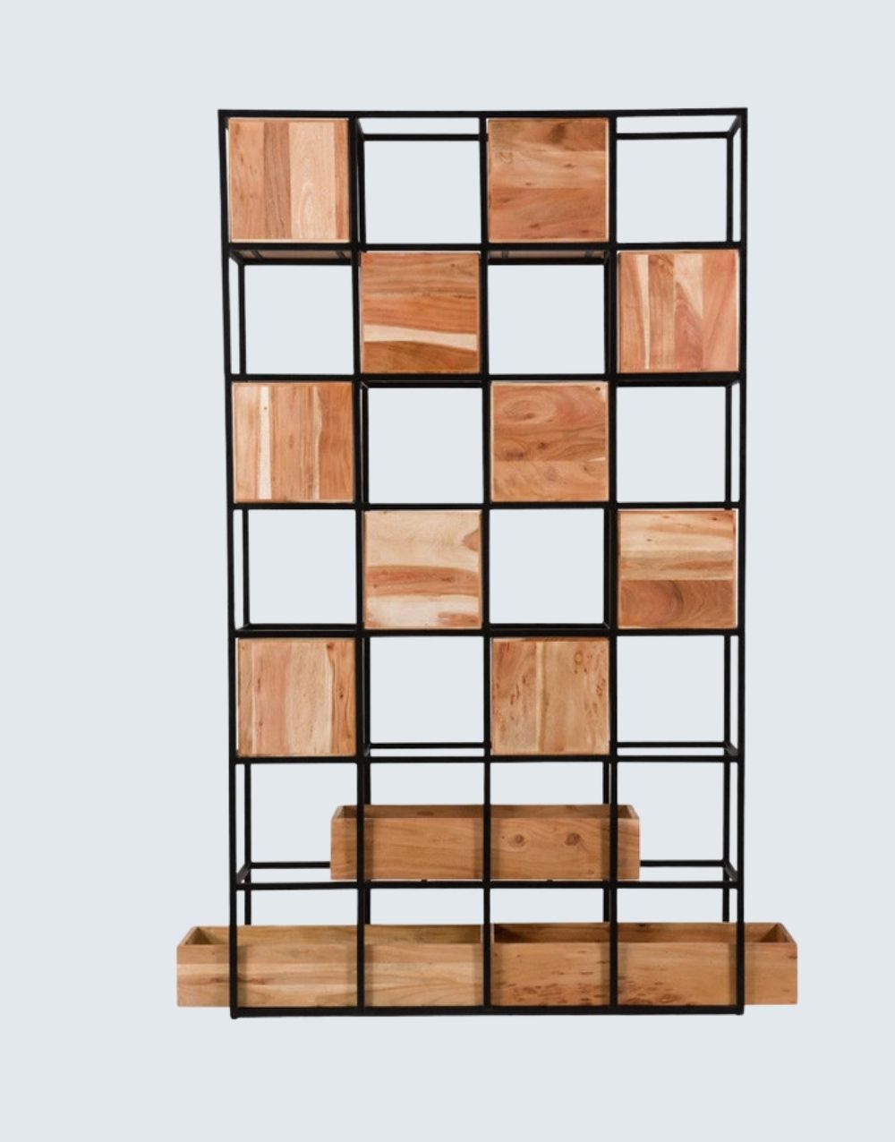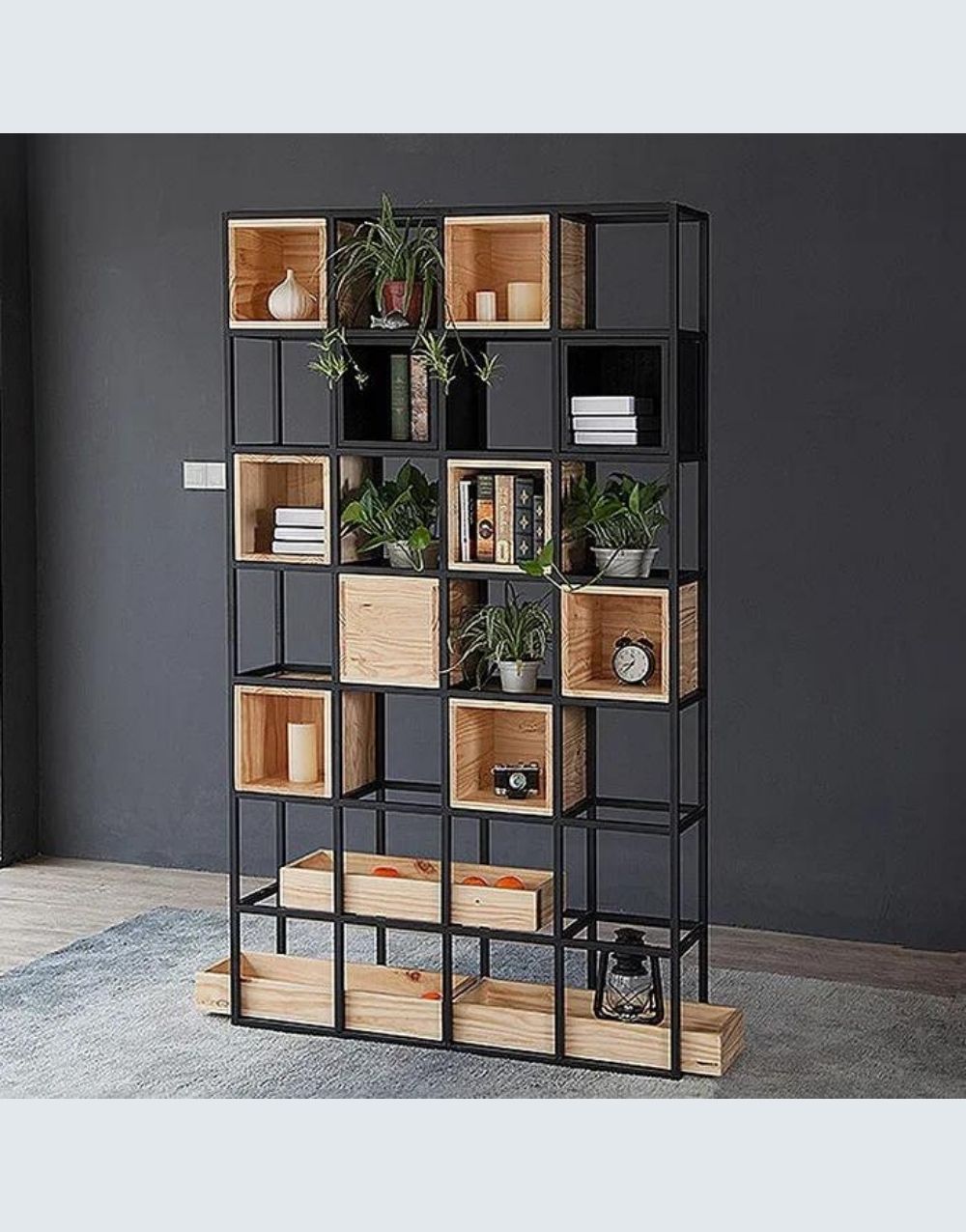Nuestra estantería BEPUS combina cubos de madera maciza con una malla tridimensional de varillas de acero, propio del estilo industrial. Los nichos flotantes crean un efecto visual único y funcional en tu hogar, añadiendo otra dimensión a tus espacios con un impacto visual impresionante. Combina metal cold rolled pintado en electrostática negro mate con entrepaños de madera maciza flor morado.