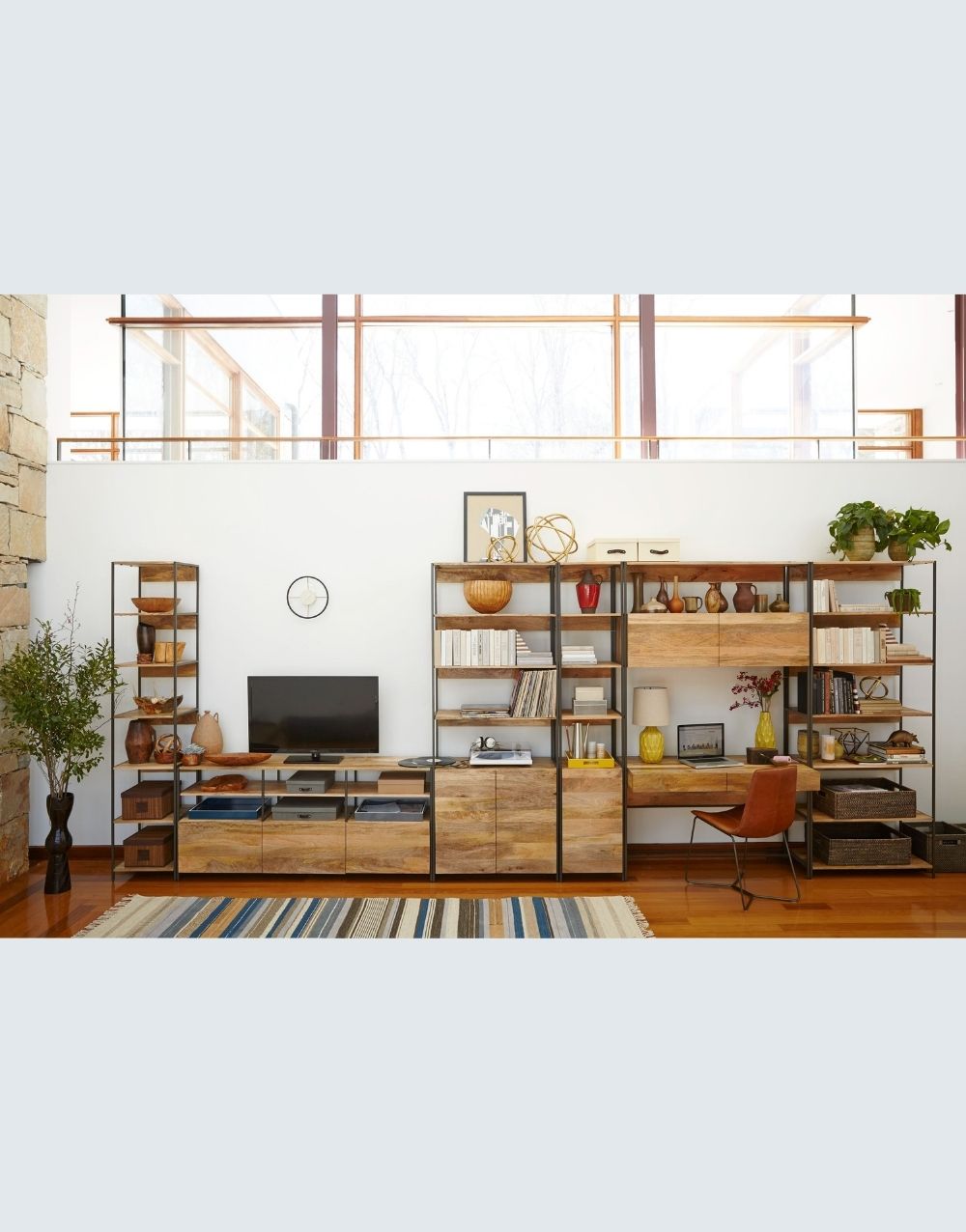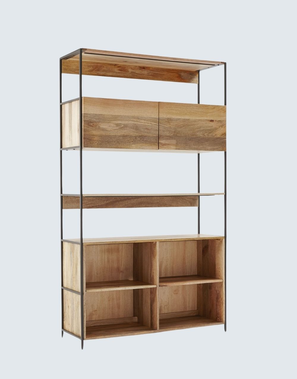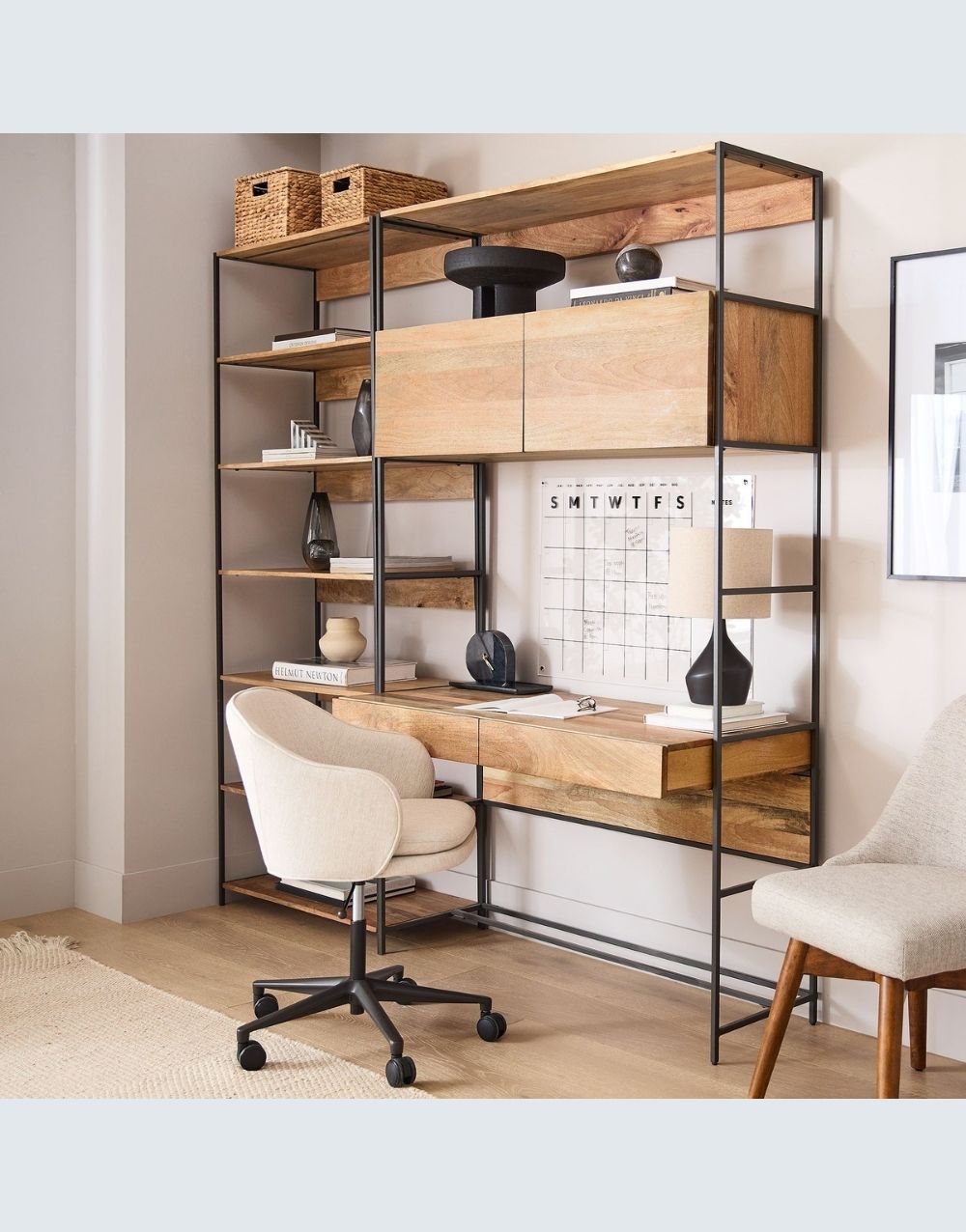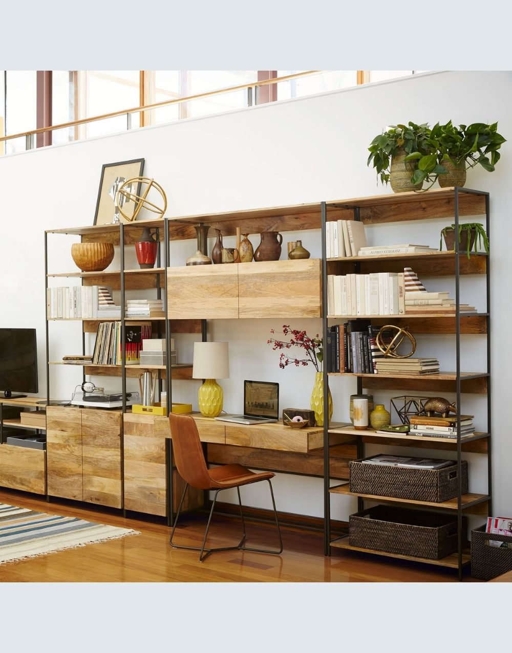 El estudio DANFI modular , en una excepcional propuesta de estilo industrial, muy completo, llevando escritorio, archivadores, cajones de almacenamiento ocultos y destapados, entrepaños para impresora, librerias y superficies para acomodar los artículos necesarios en tu espacio funcional. La calidez de sus materiales hará acogedor y confortable tu sitio de trabajo potenciando tu trabajo, bien sea en casa u oficina. Combina metal cold rolled pintado en electrostática negro mate con madera maciza en diferentes estilos.