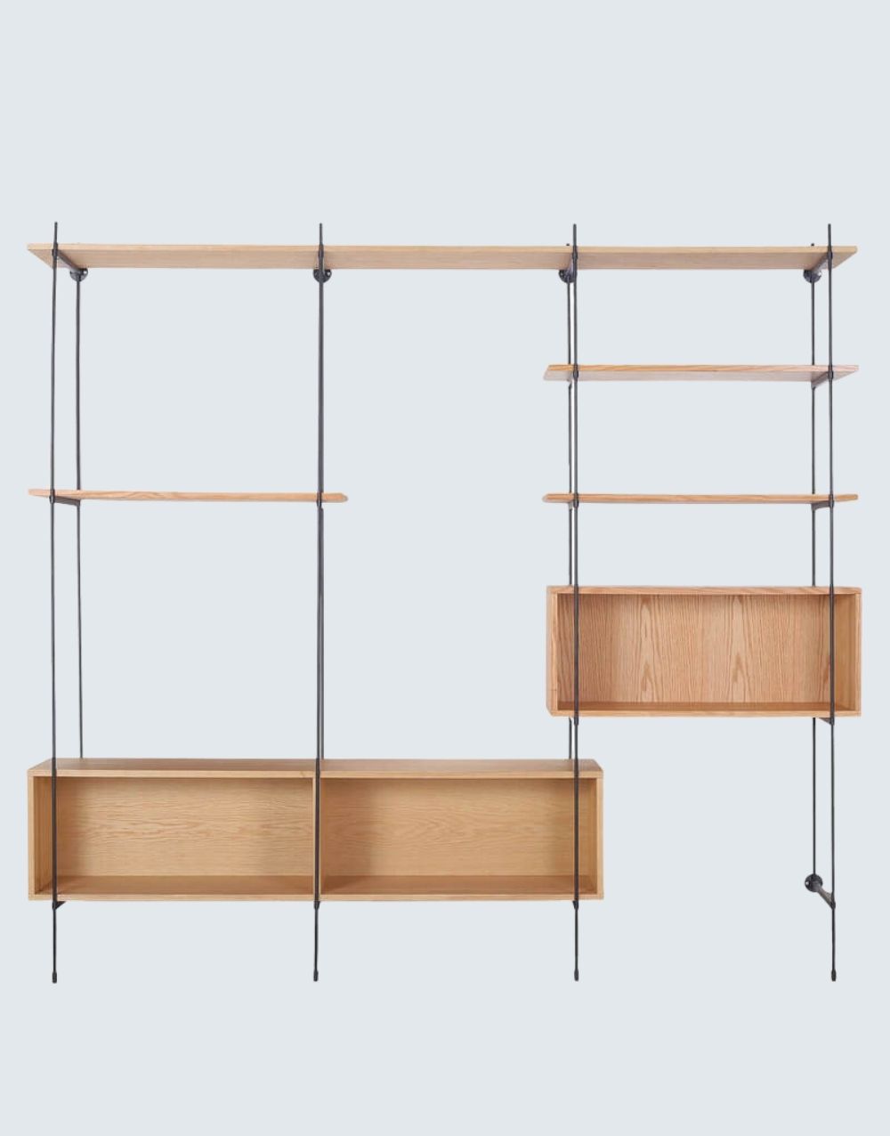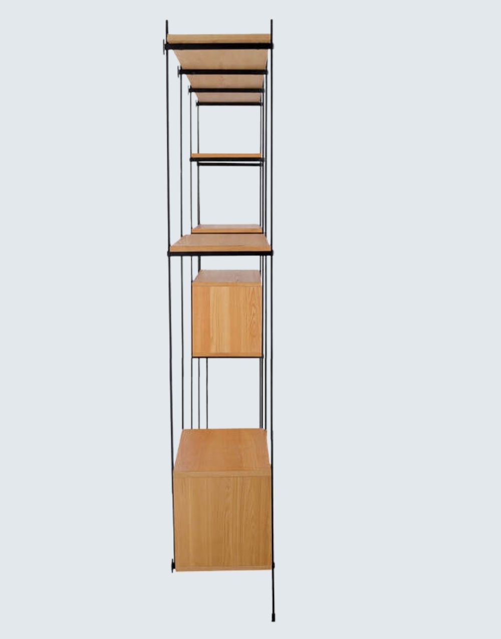La estantería TOPOX combina almacenamiento cubierto y descubierto, ideal para casa u oficina. Con un diseño sencillo al estilo escandinavo, ofrece calidez y funcionalidad. Su diseño en madera maciza y varillas moduladas de acero cold rolled pintado en electrostática negro mate proporciona practicidad en la instalación y añade personalidad a tus espacios.