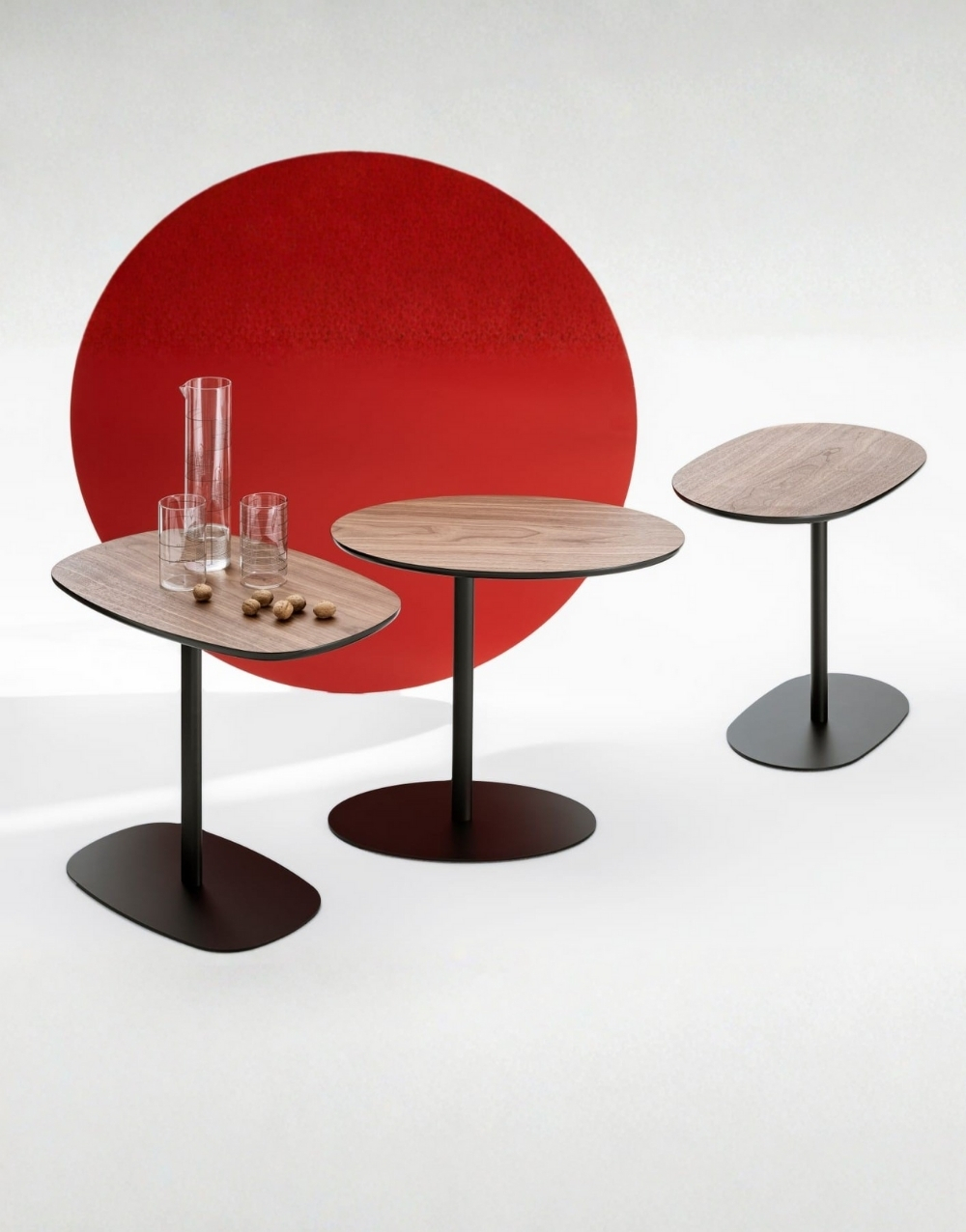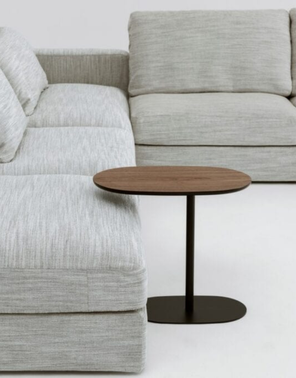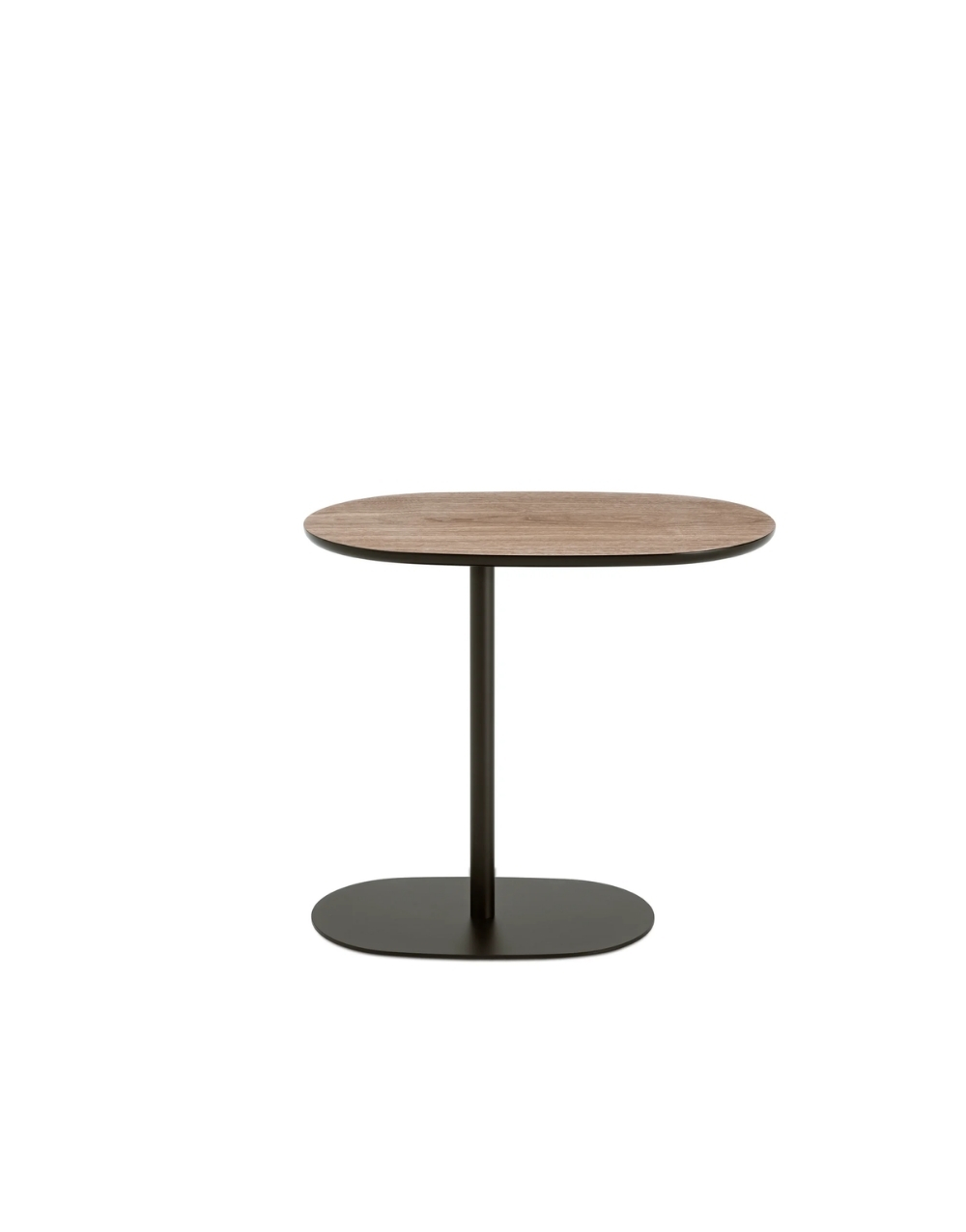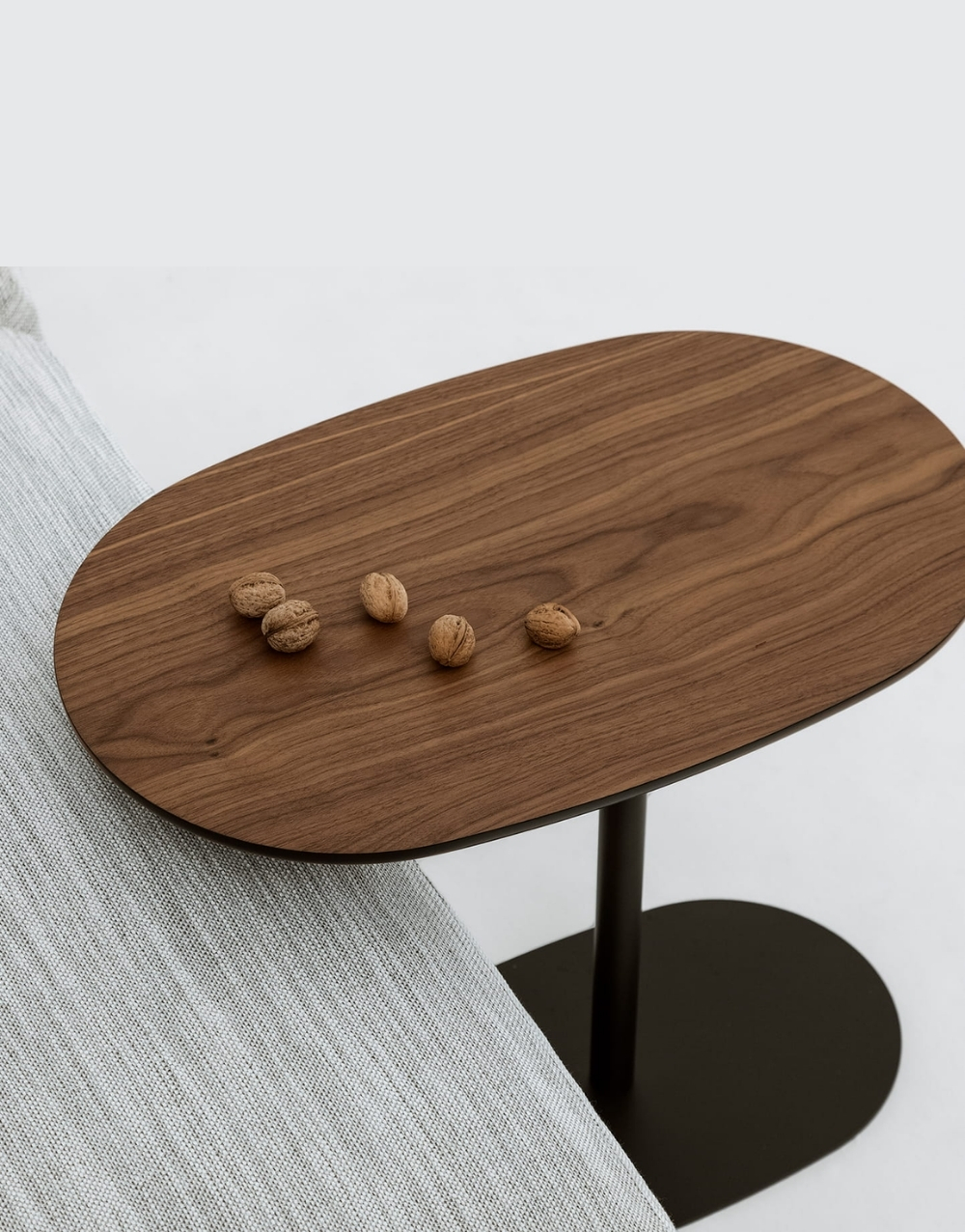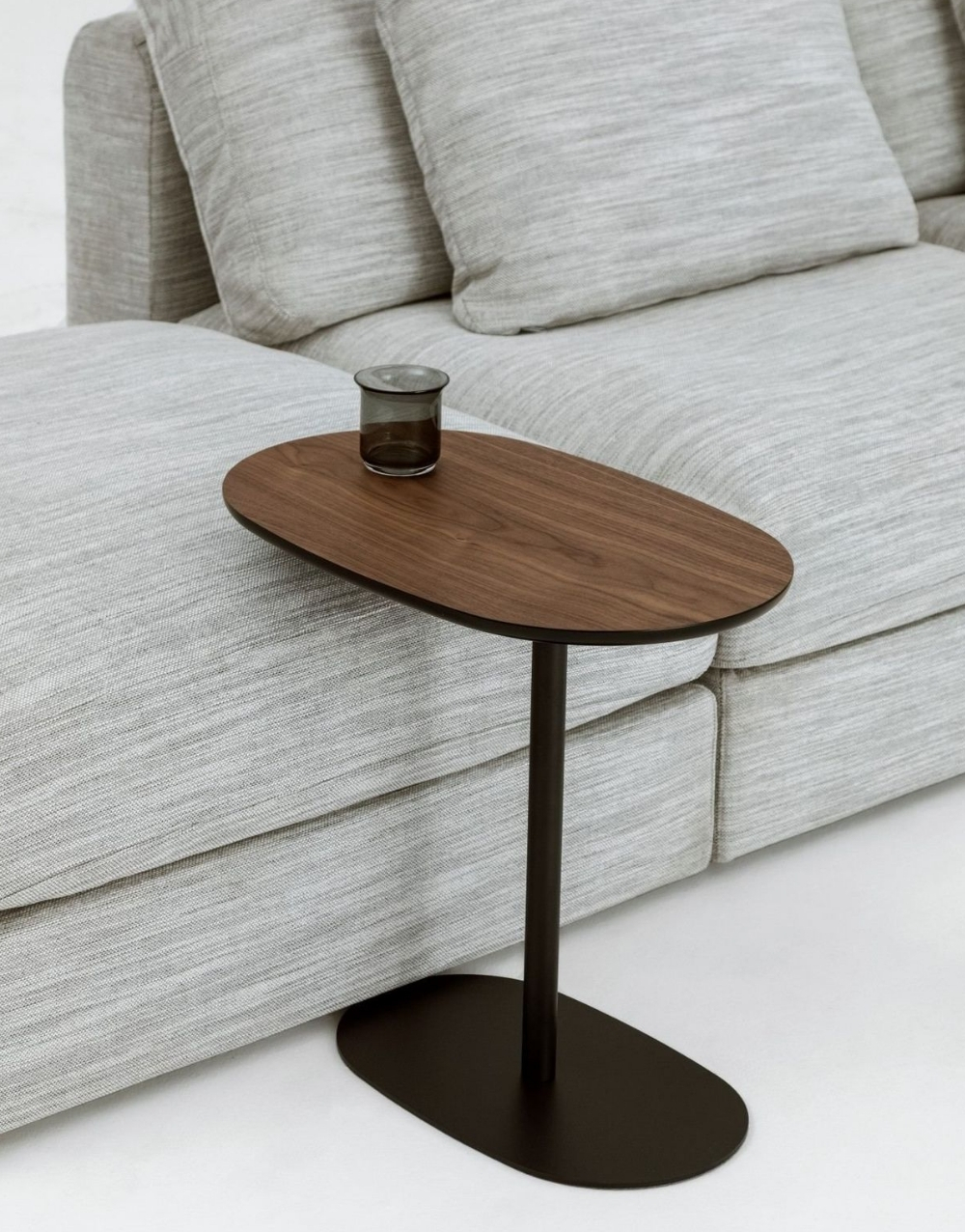 La mesa auxiliar tiene un diseño moderno y minimalista, formada por una base metálica negra con contorno orgánico y un mástil vertical delgado que sostiene un tablero ovalado de madera maciza flor morado. Su estructura es ligera y estilizada, pensada para deslizarse junto a un sofá y funcionar como superficie práctica para objetos pequeños .