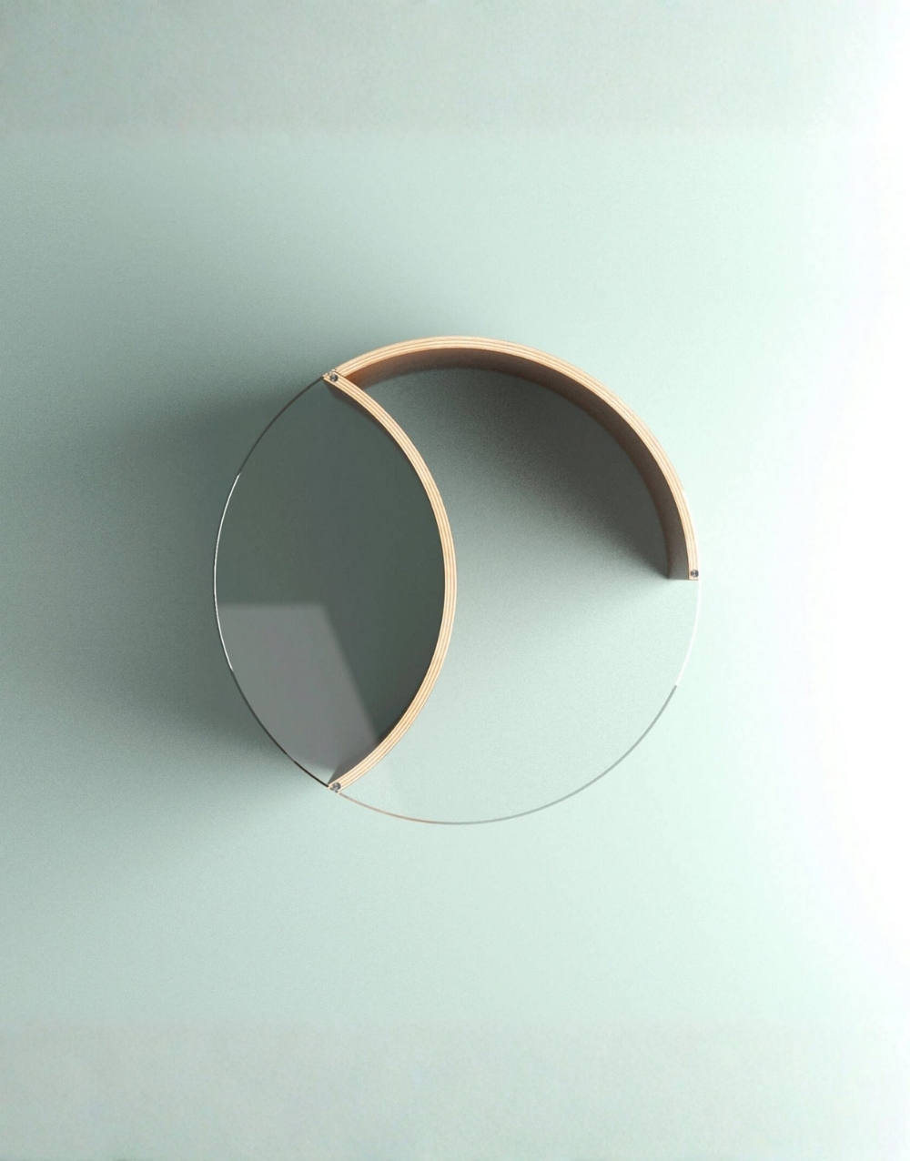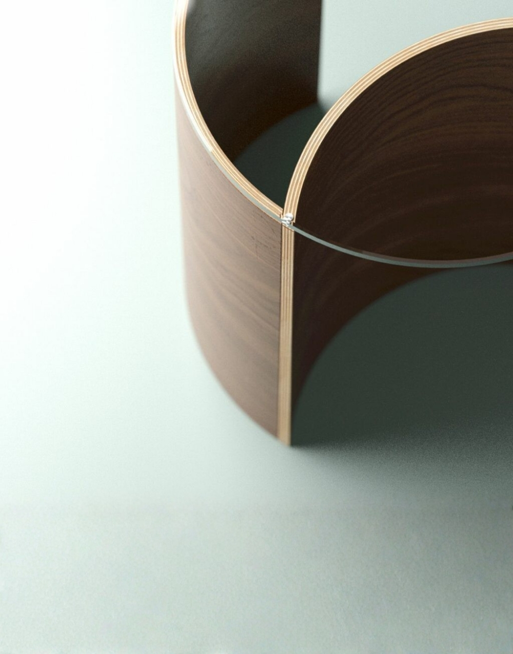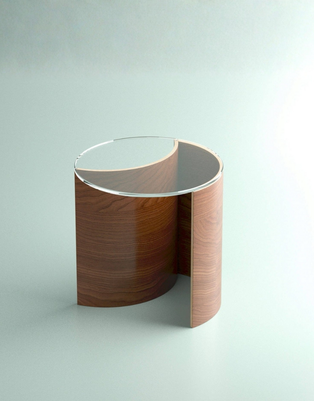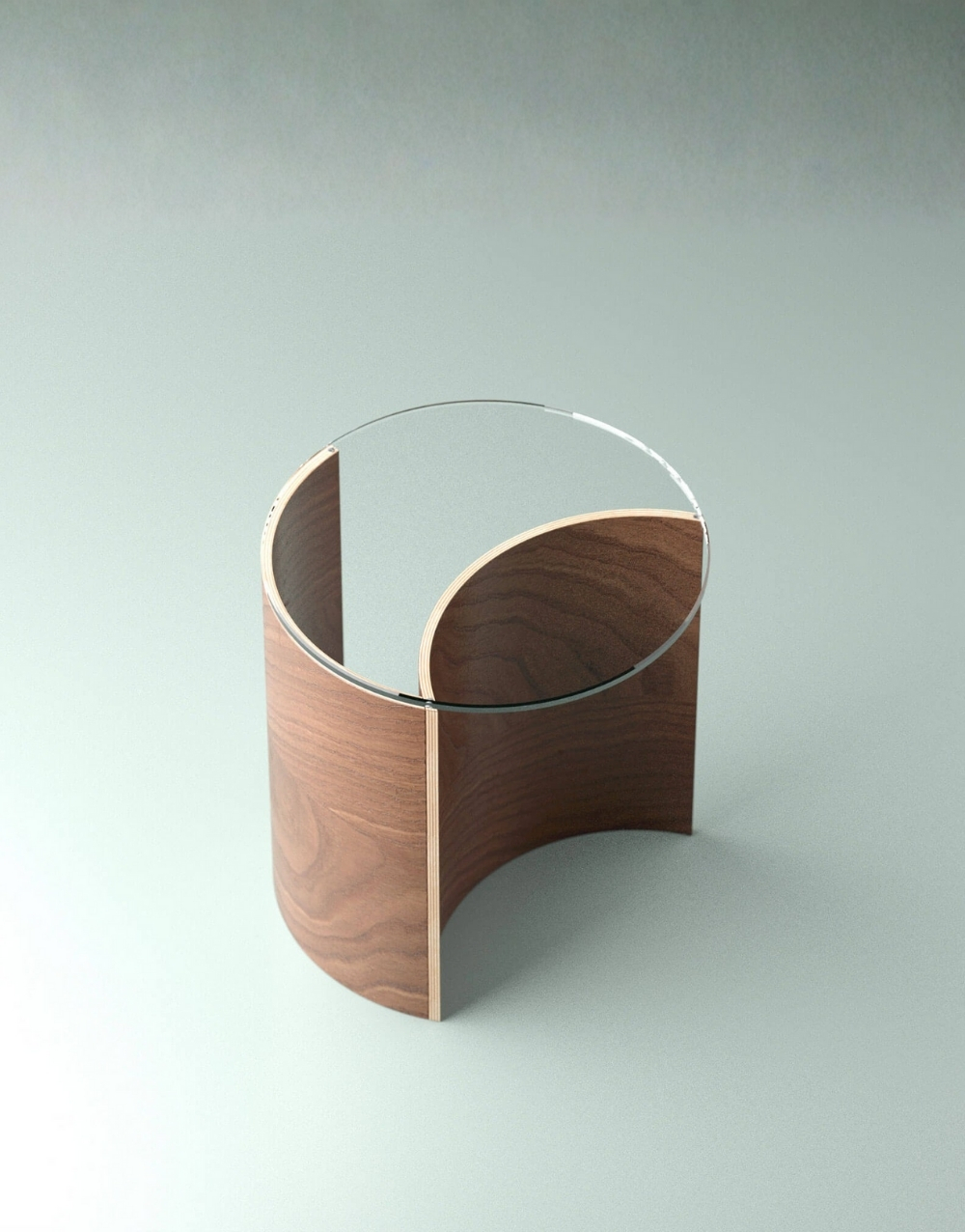 Mesa auxiliar de diseño moderno compuesta por una base de madera curvada en forma de semicírculo y tapa redonda de vidrio transparente. La estructura combina líneas suaves y materiales contrastantes, dando como resultado una pieza elegante, minimalista y visualmente ligera.