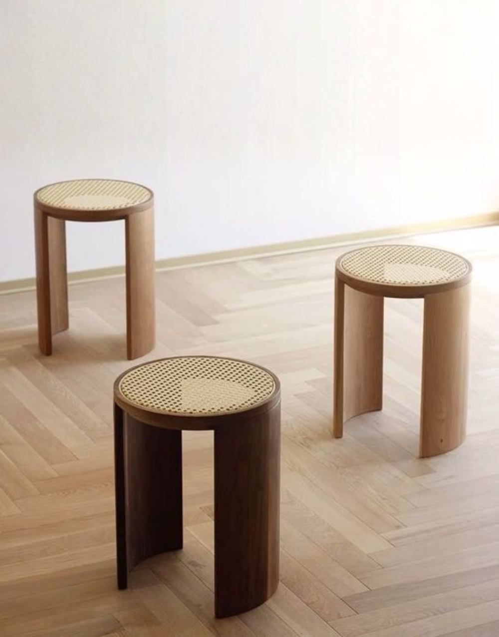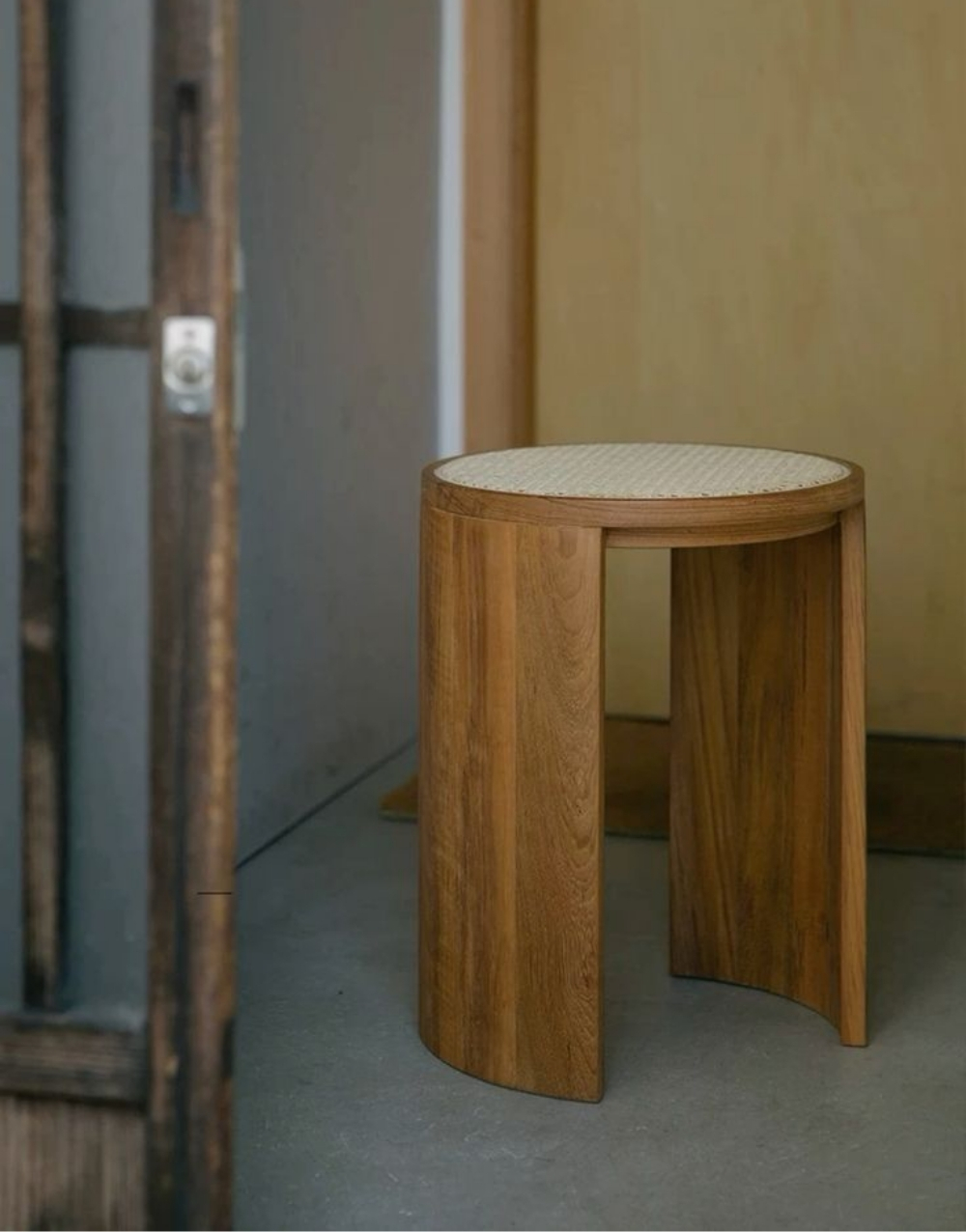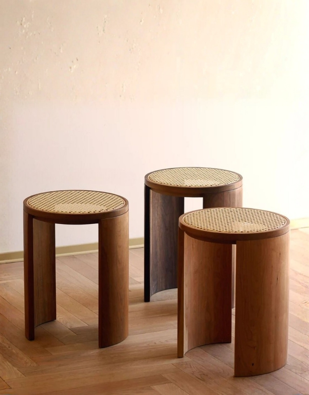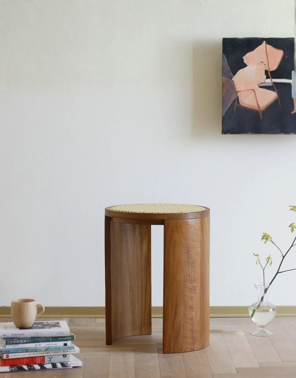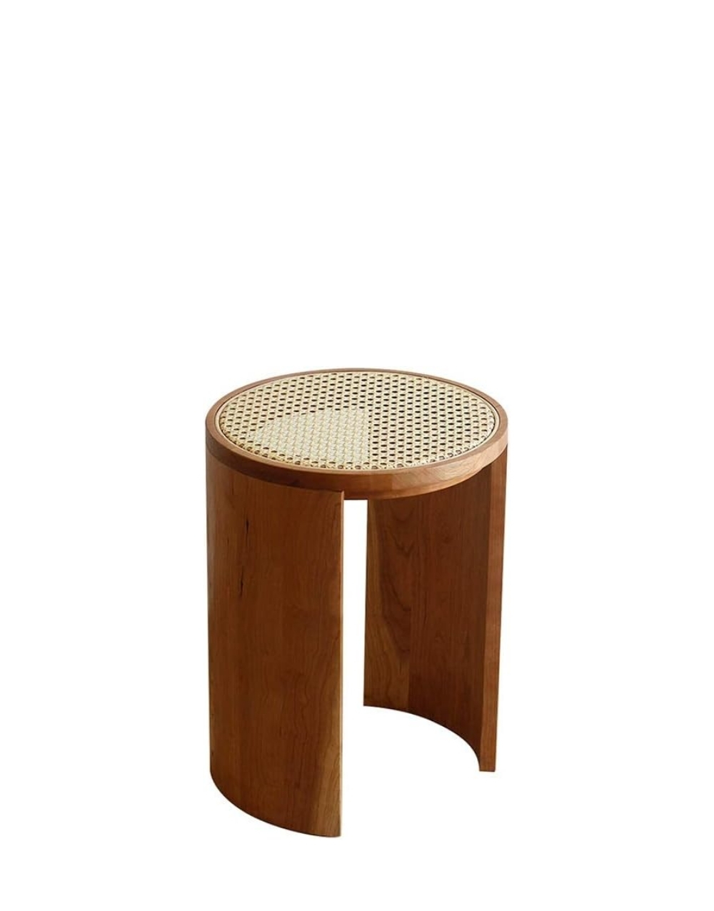 Mesa auxiliar de diseño minimalista que combinan la calidez de la madera con la textura artesanal del mimbre. Las patas de madera curvada en forma de herradura o ‘C’, creando un espacio abierto. La tapa es circular y está incrustada con tejido de ratán que le da un toque vintage renovado y ligereza visual, ofreciendo una opción versátil y de tendencia que equilibra lo moderno y lo tradicional.