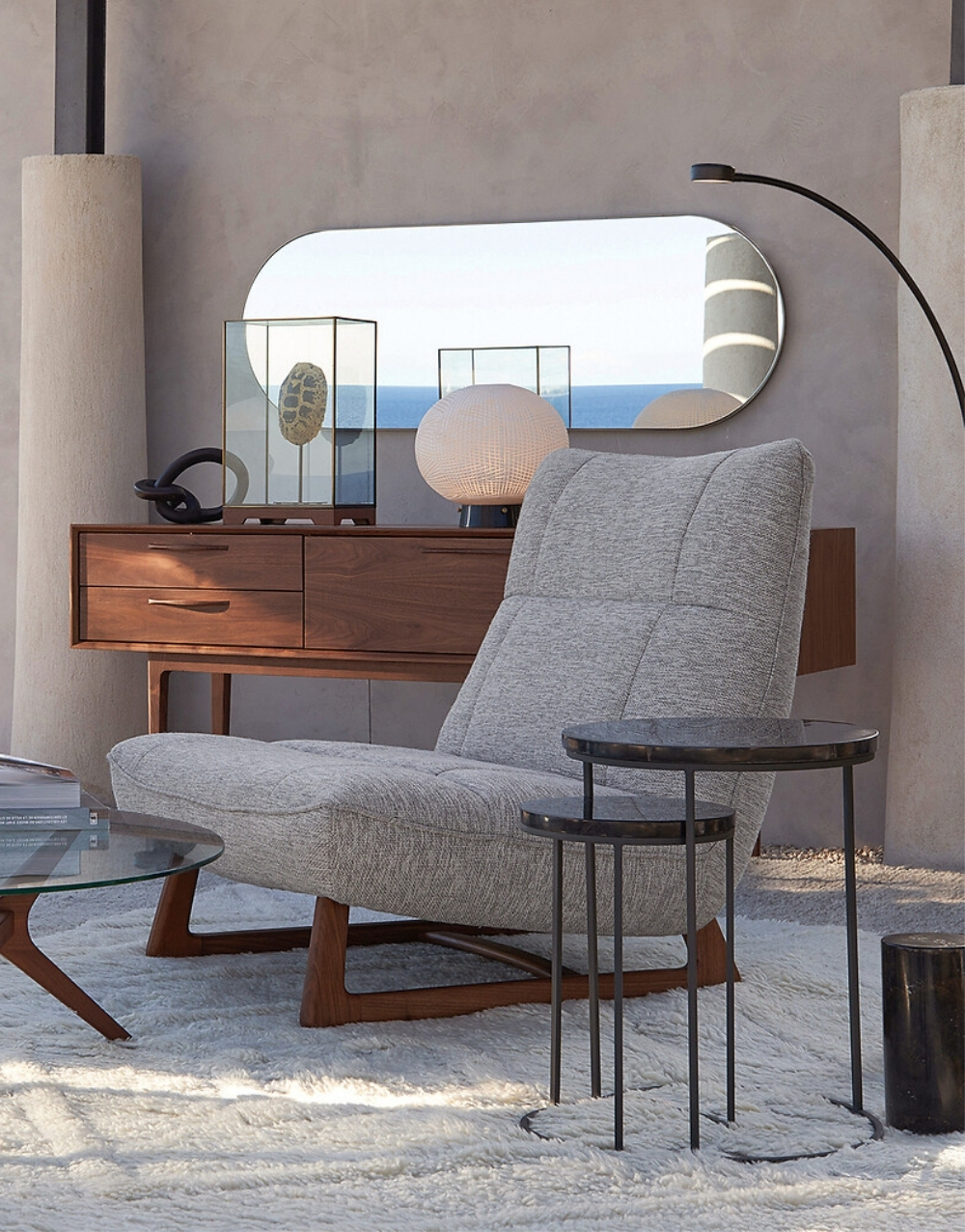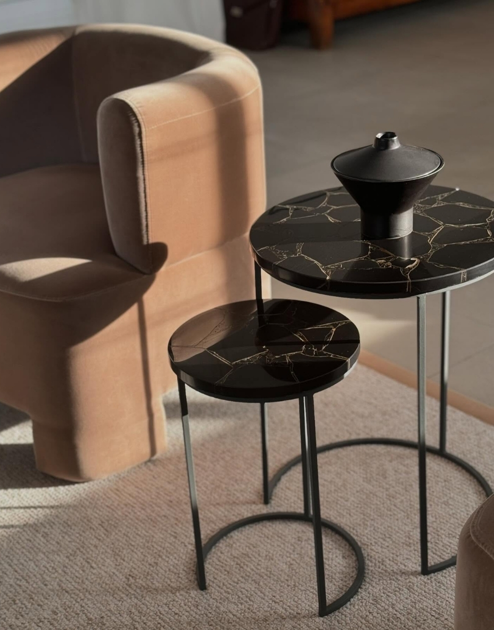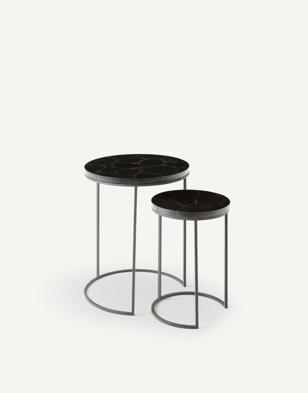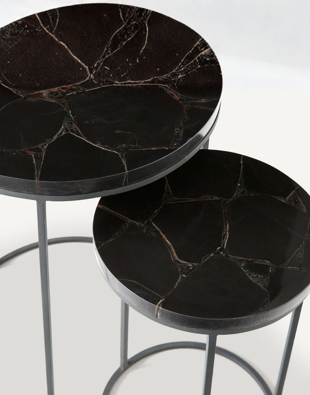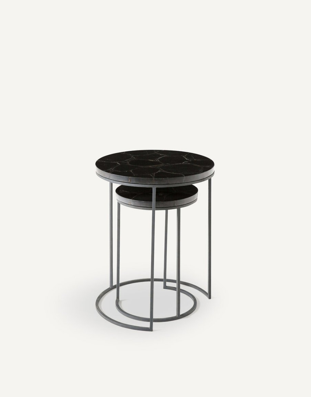 Conjunto de dos mesas auxiliares redondas de estructura metálica y sobres en piedra sinterizada. La base texturizada metálica con patrón orgánico y líneas limpias le aporta ligereza y elegancia al conjunto, y el juego entre tamaños y alturas le da un estilo minimalista y contemporáneo ideal para decorar salas modernas.