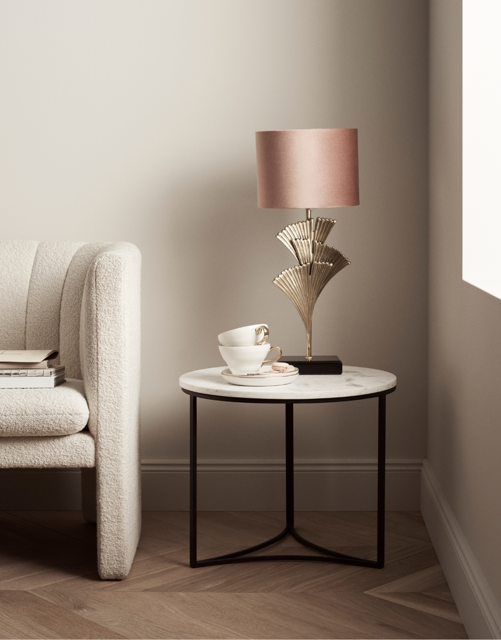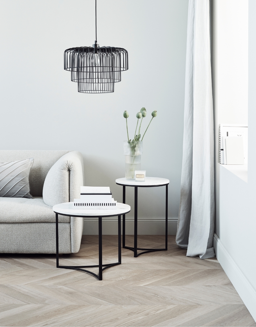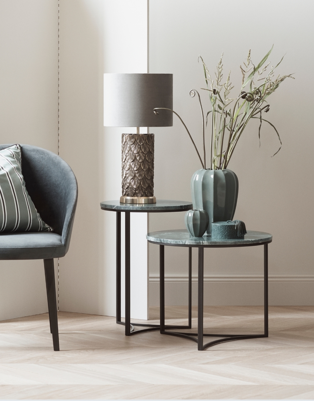 Conjunto de dos mesas auxiliares redondas de estructura metálica y sobres en piedra sinterizada. La base texturizada metálica con patrón orgánico y líneas limpias le aporta ligereza y elegancia al conjunto, y el juego entre tamaños y alturas le da un estilo minimalista y contemporáneo ideal para decorar salas modernas.