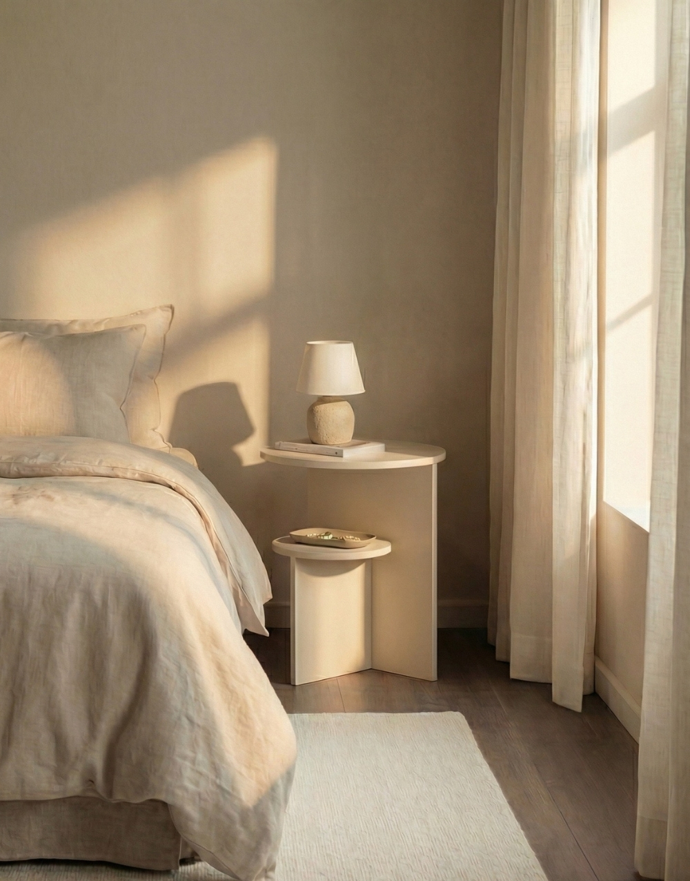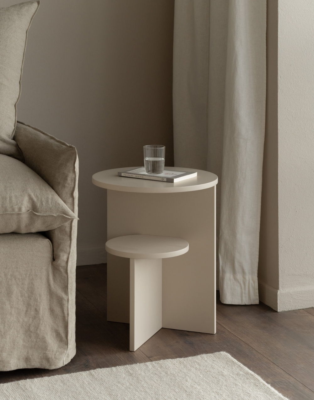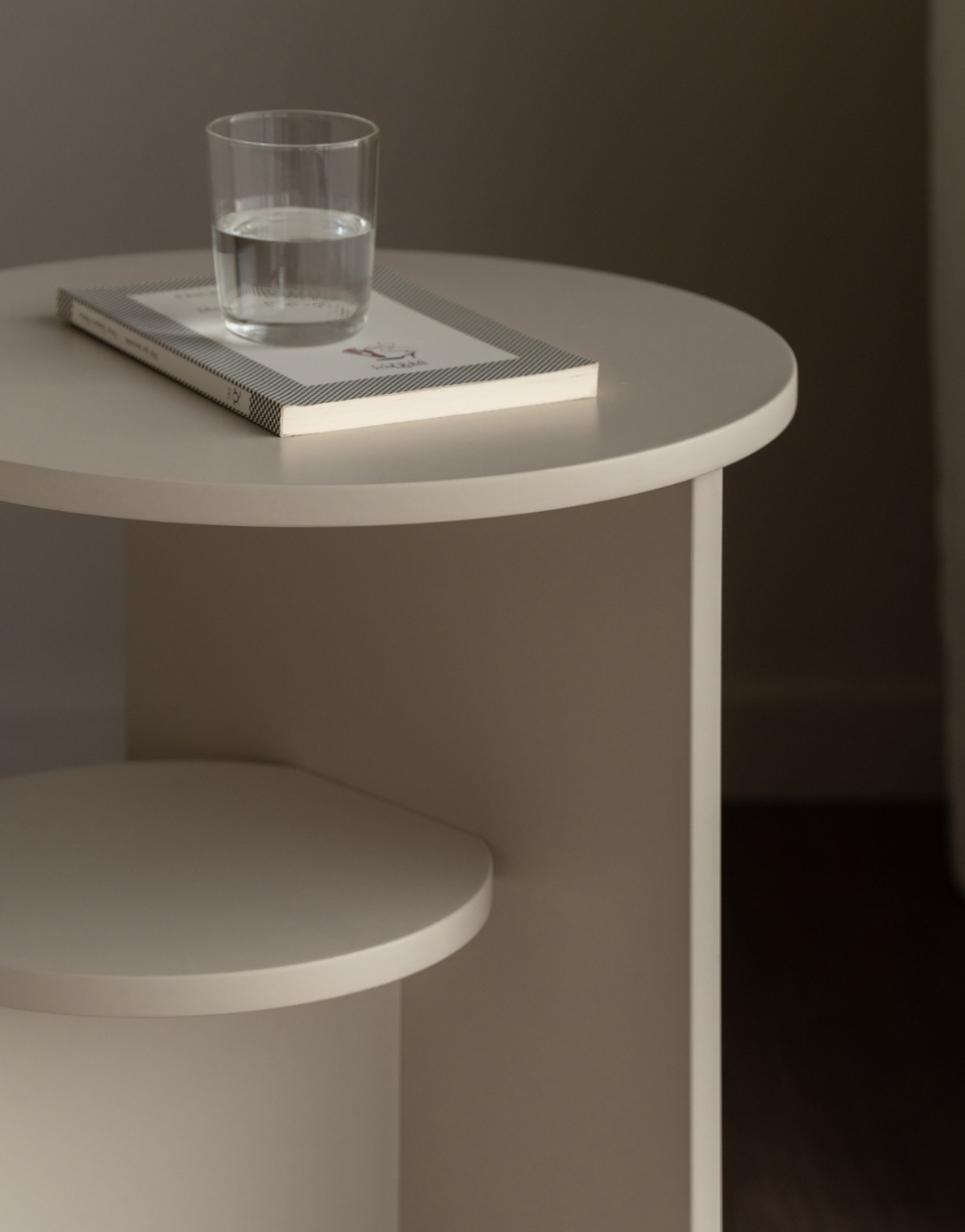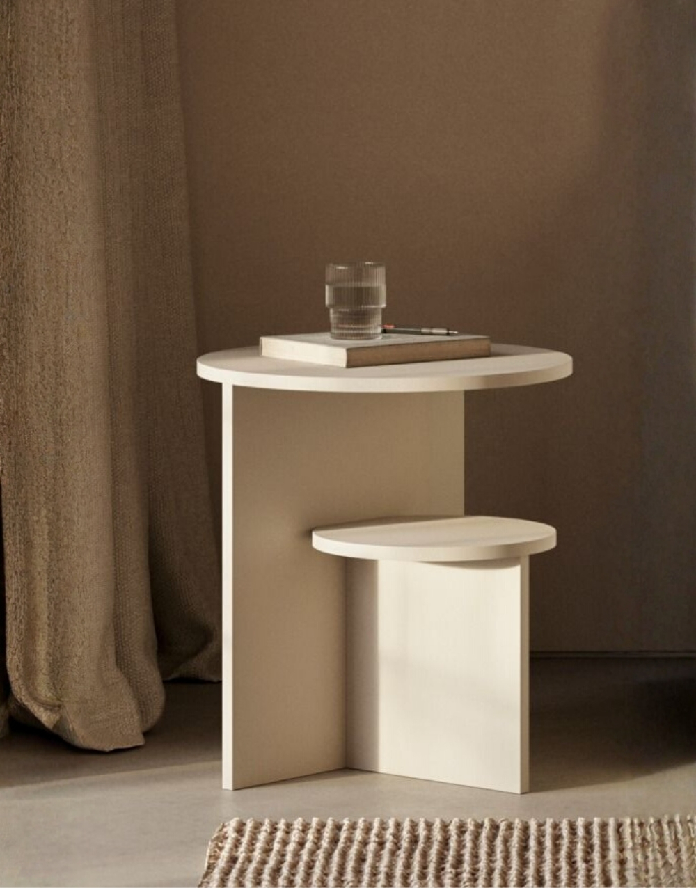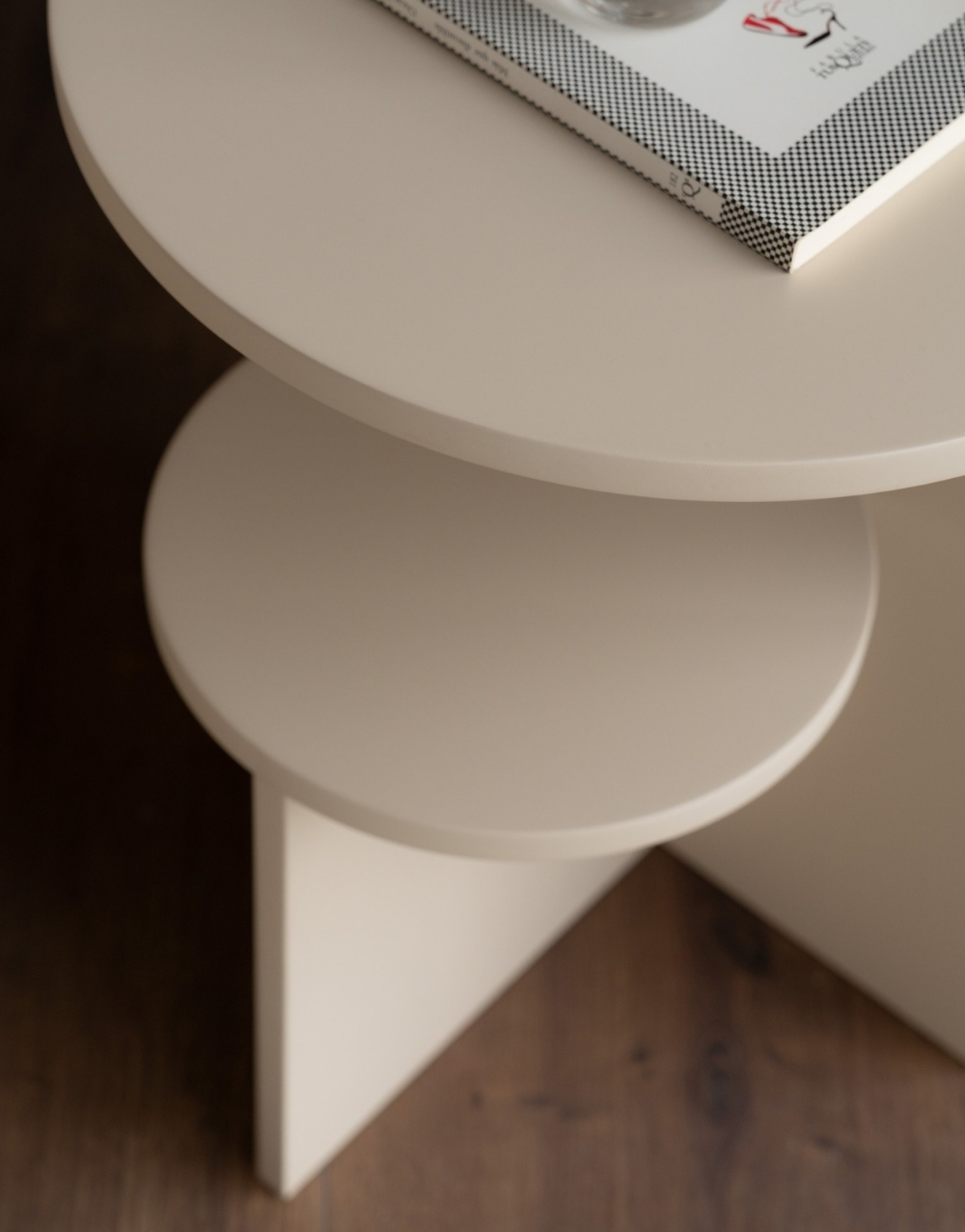 Mesa auxiliar de diseño minimalista y geométrico, construida en un acabado uniforme con superficies completamente lisas y aristas limpias. La estructura se compone de dos planos verticales en forma de “X” desplazada, que sostienen dos superficies circulares: una principal en la parte superior y otra secundaria en un nivel inferior lateral, ambas de grosor delgado y proporciones equilibradas. La mesa presenta un estilo contemporáneo con líneas simples y destaca por su estabilidad visual y su integración armónica con el entorno neutro del espacio enfatizando su función práctica como mesa de apoyo.