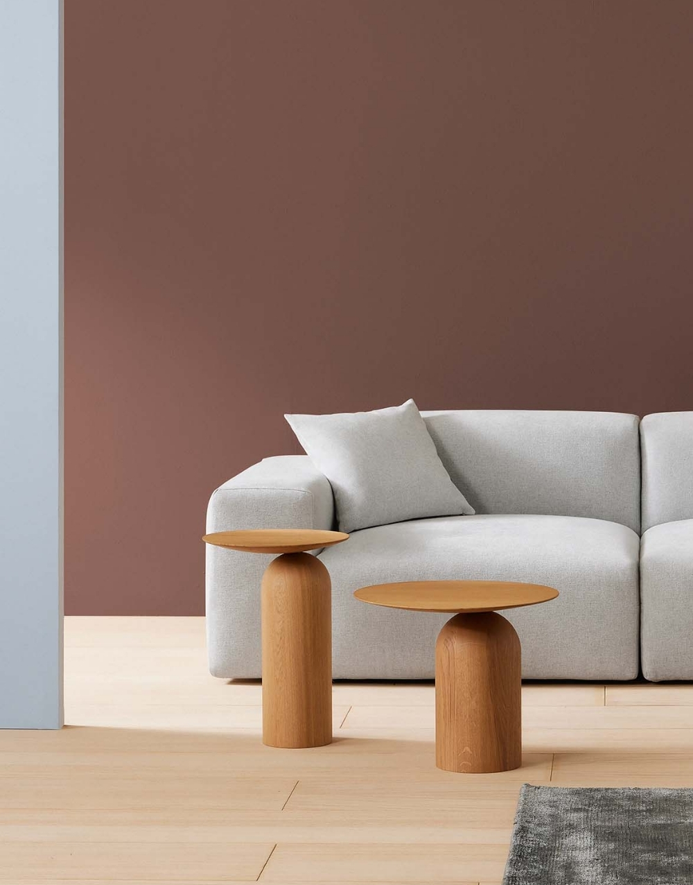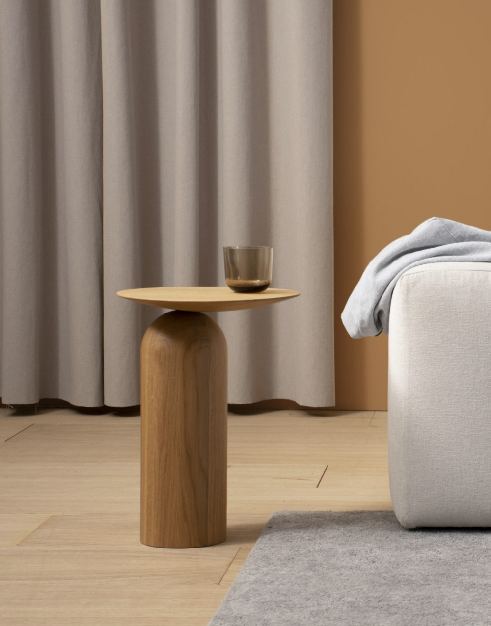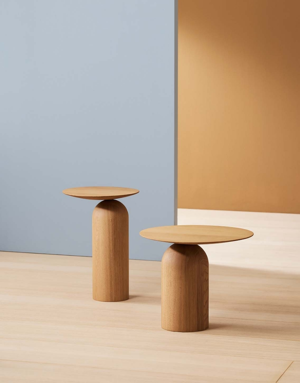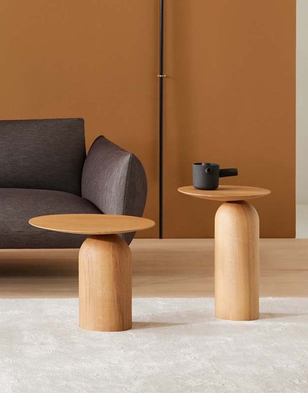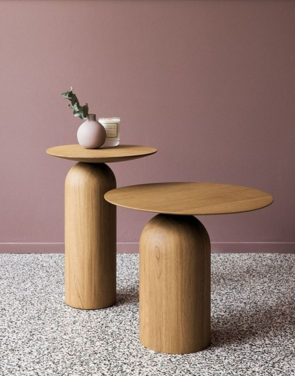 Par de mesitas auxiliares con un diseño minimalista y orgánico. Están fabricadas en madera maciza flor morado y madera industrializada chapillada en roble catedral, con una veta pronunciada. Su estructura se compone de una base gruesa en forma de cilindro sólido y una tapa redonda y delgada que parece flotar sobre la base. De estilo escandinavo, priorizando las formas puras, la funcionalidad simple y la belleza del material natural.