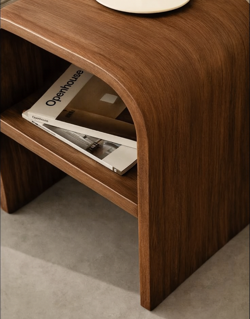 Mesa auxiliar de diseño curvo fabricada en madera industrializada enchapada. Su estructura está compuesta por láminas redondeadas que forman un arco continuo, creando un volumen suave y orgánico. Incluye una repisa inferior integrada para almacenamiento ligero. Su estética cálida y elegante es ideal para interiores contemporáneos y ambientes de estilo japandi.