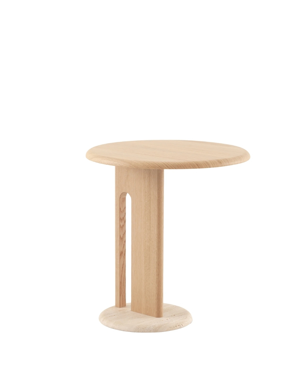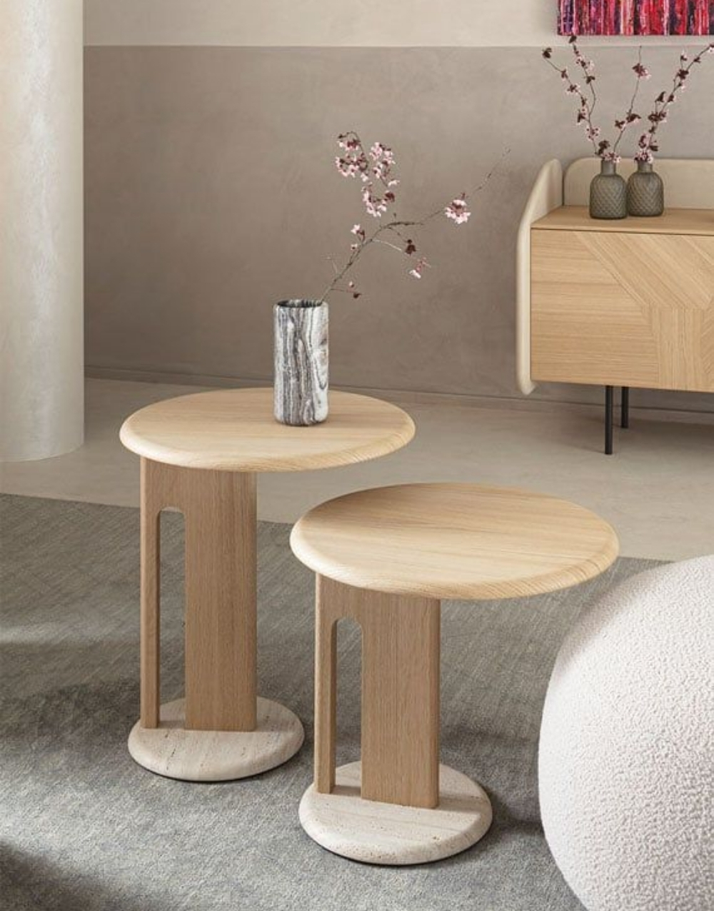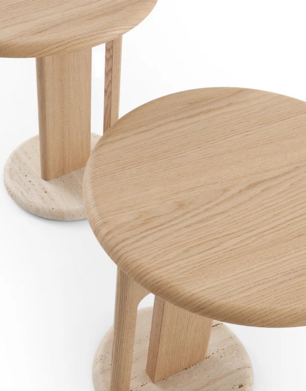Mesa auxiliares de estilo contemporáneo que combinan materiales naturales con un diseño minimalista. Ambas tienen una tapa redonda de madera clara (posiblemente roble) con bordes suaves. La base consiste en un pie vertical rectangular con un corte curvo en un lateral, dando la impresión de ligereza. Lo más distintivo es el zócalo o base de soporte, que es un círculo plano y grueso hecho de piedra natural clara, probablemente travertino o mármol con motas, lo que añade peso visual y un contraste de textura sofisticado con la madera lisa. El diseño es elegante, orgánico y se integra perfectamente en un ambiente moderno y de tonos neutros.