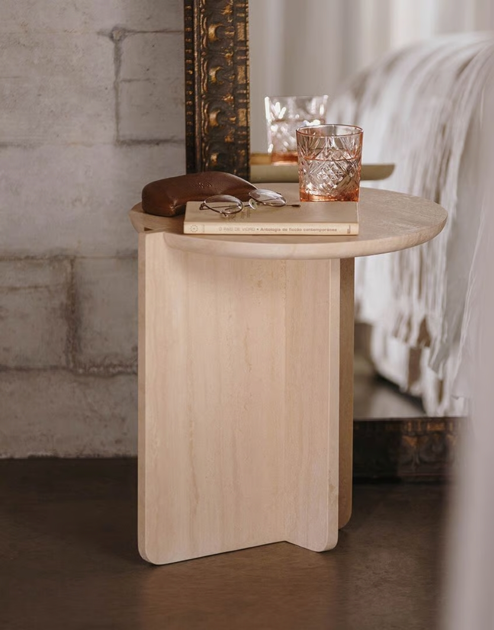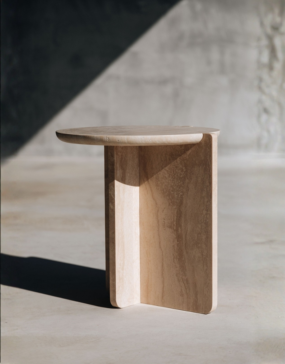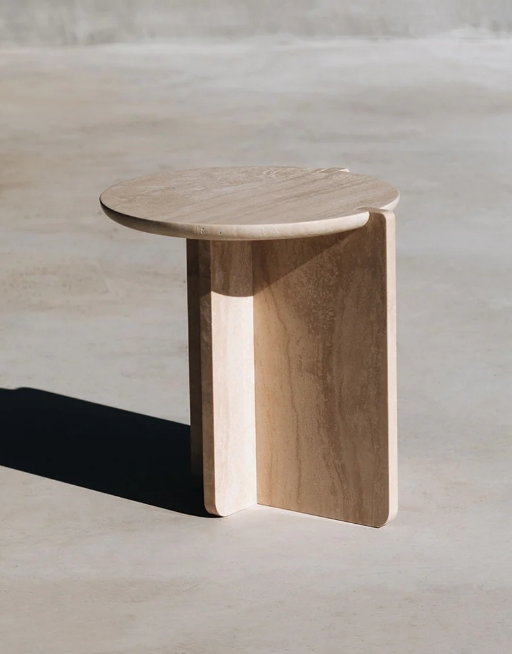Mesa auxiliar de diseño minimalista fabricada en madera maciza flor morado. Presenta una tapa circular de bordes suavemente redondeados y una base en forma de “T” maciza, que aporta estabilidad y un carácter escultórico. Su estética limpia y contemporánea la hace ideal para interiores modernos y ambientes de inspiración mediterránea.