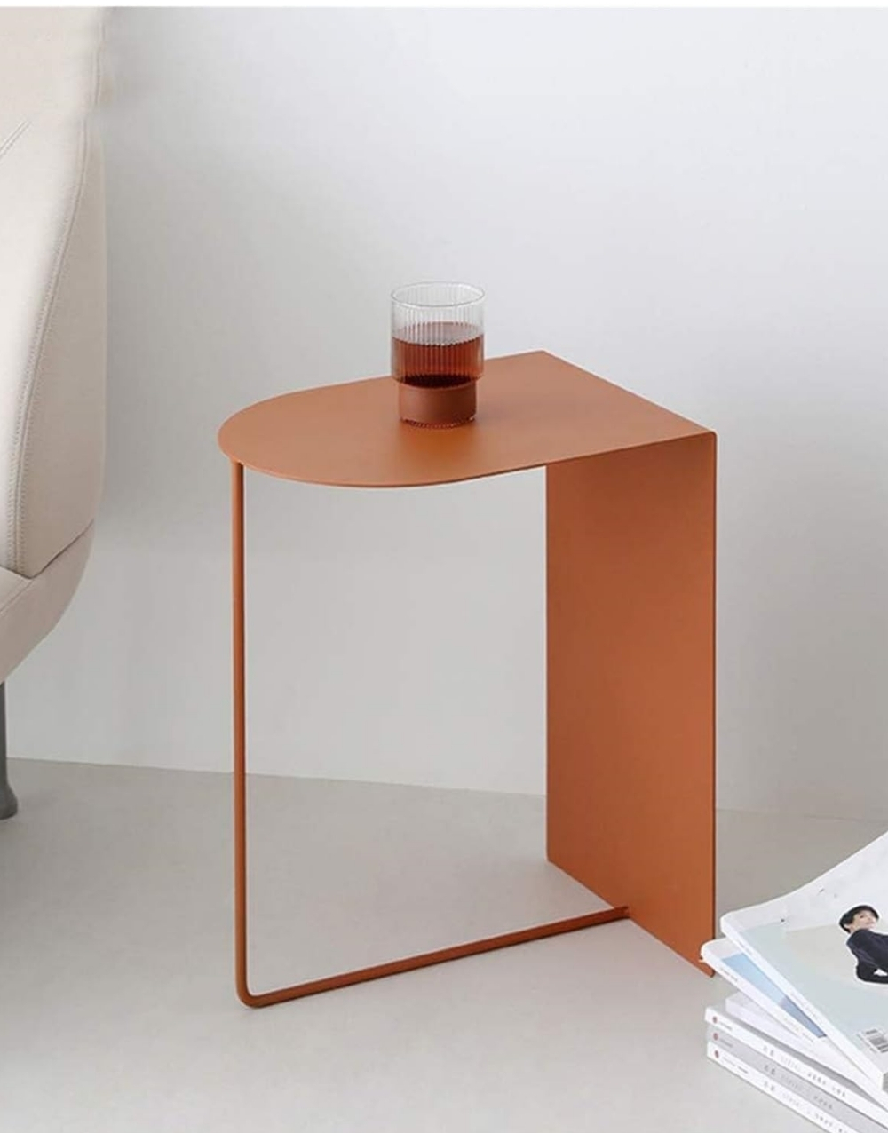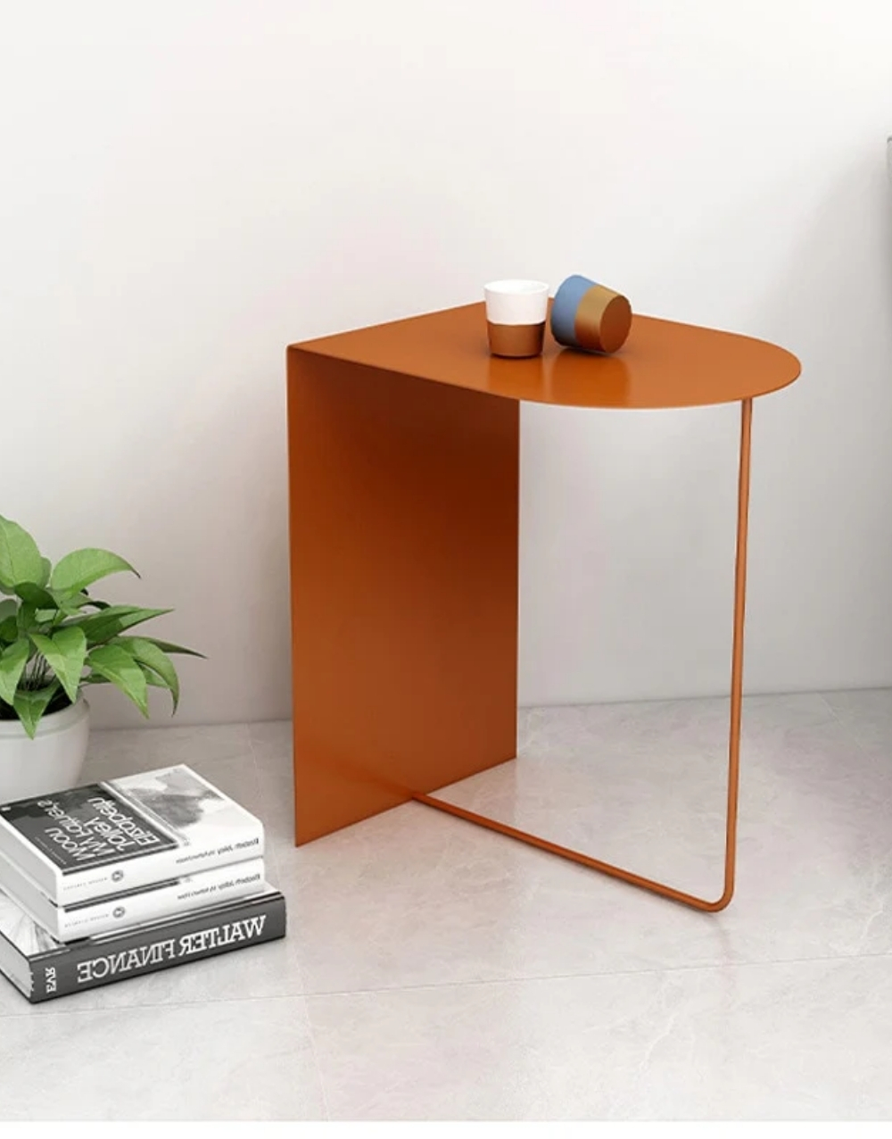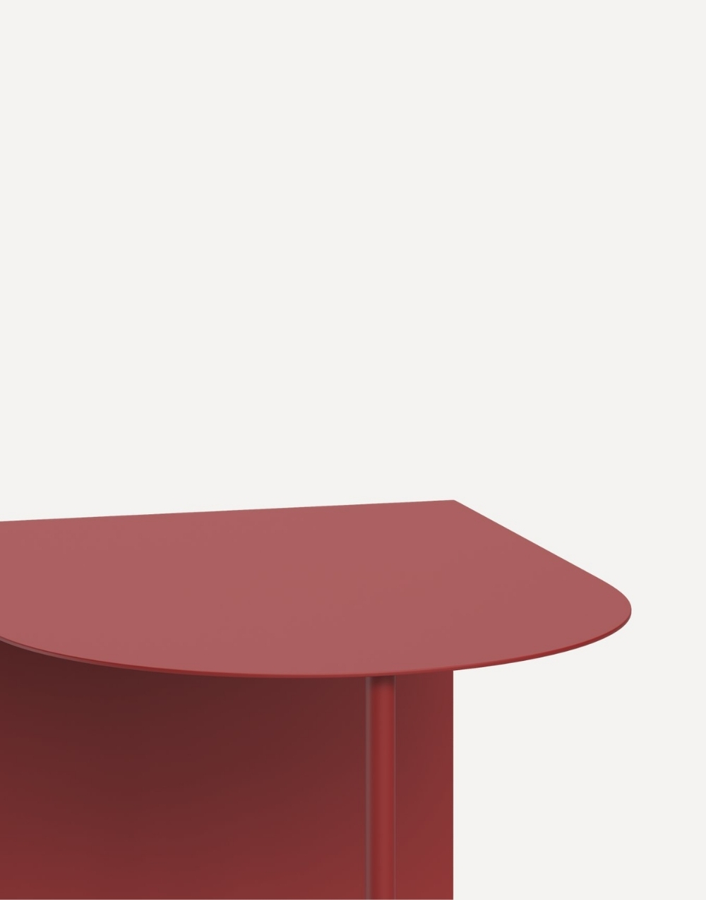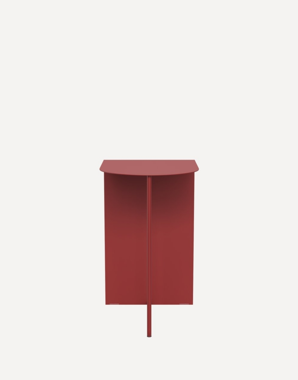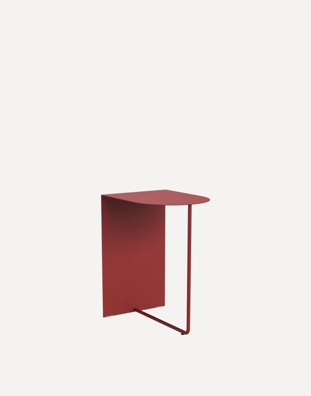 Mesa auxiliar de diseño ultraminimalista y moderno fabricada en metal cold rolled pintada en electrostatica acabado mate. Su diseño se basa en una forma geométrica simple, la tapa es un cuadrante de círculo y la base consiste en un panel vertical que forma un ángulo de 90 grados unido a un tubo que completa la mesita creando un efecto visual de ligereza que contrasta fuertemente con la solidez del marco de color.