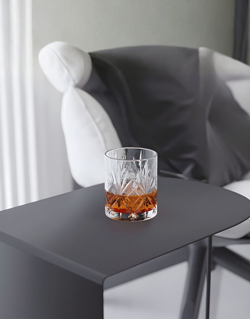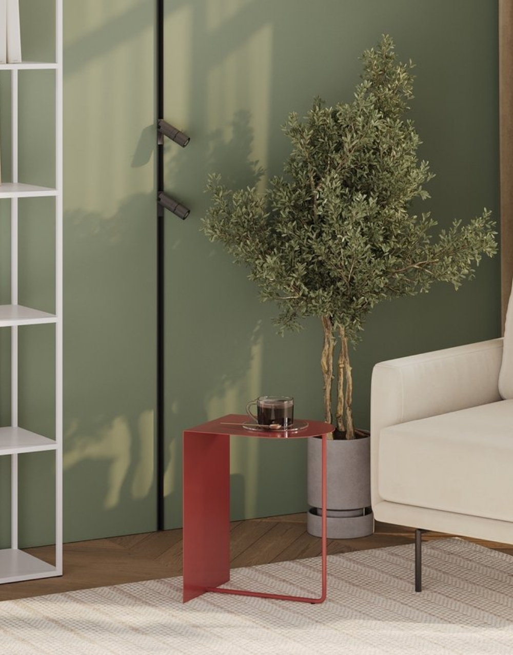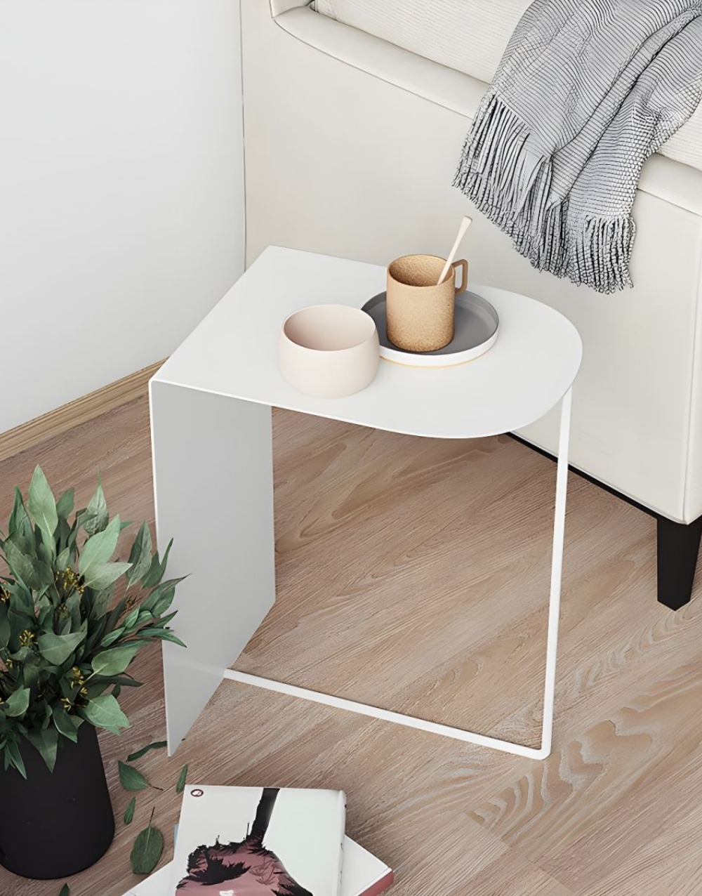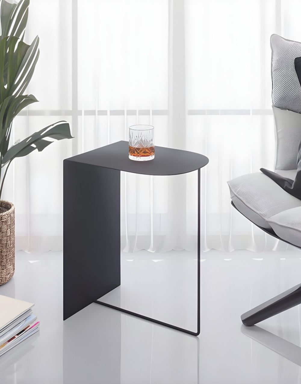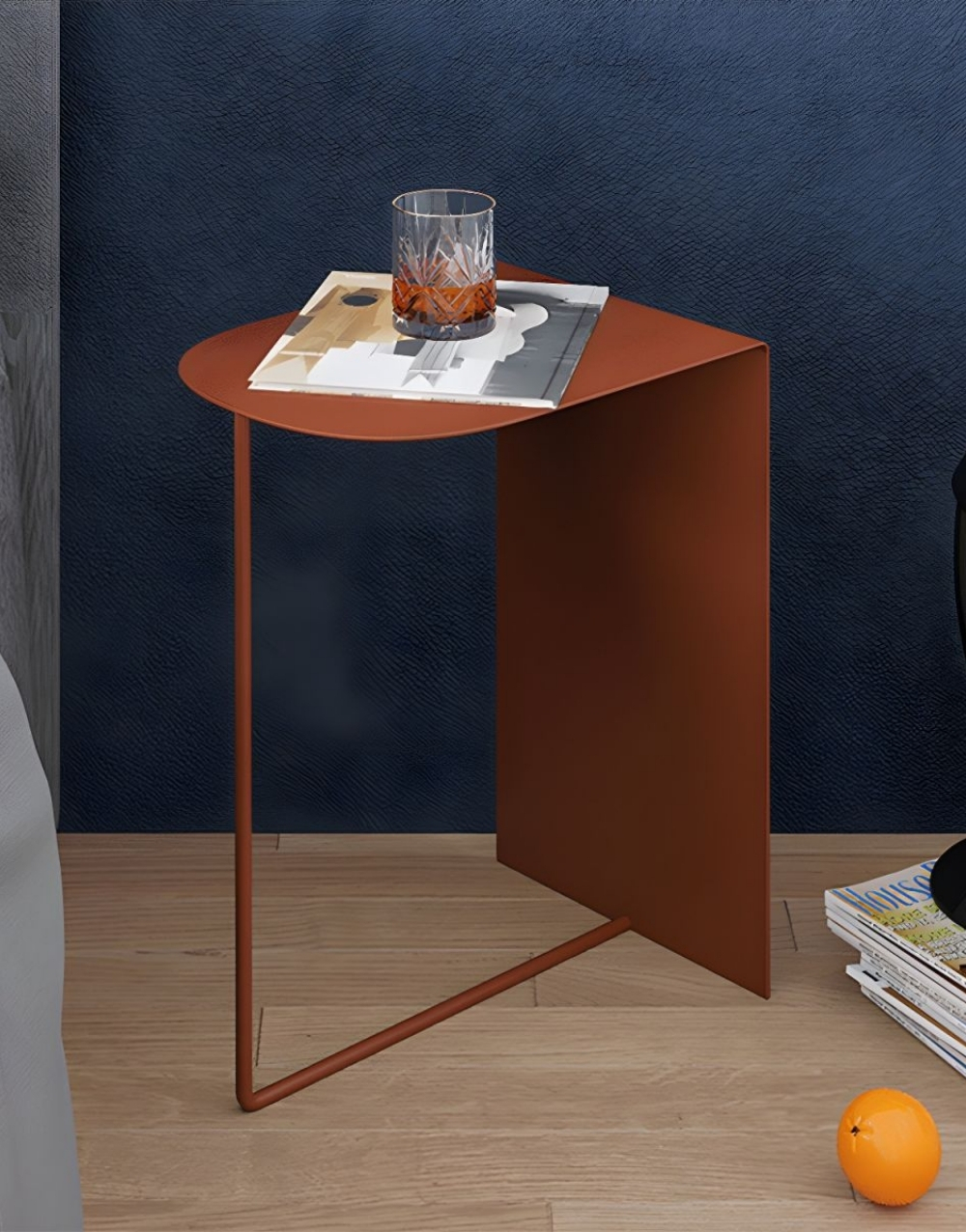 Mesa auxiliar de diseño ultraminimalista y moderno fabricada en metal cold rolled pintada en electrostatica acabado mate. Su diseño se basa en una forma geométrica simple, la tapa es un cuadrante de círculo y la base consiste en un panel vertical que forma un ángulo de 90 grados unido a un tubo que completa la mesita creando un efecto visual de ligereza que contrasta fuertemente con la solidez del marco de color.