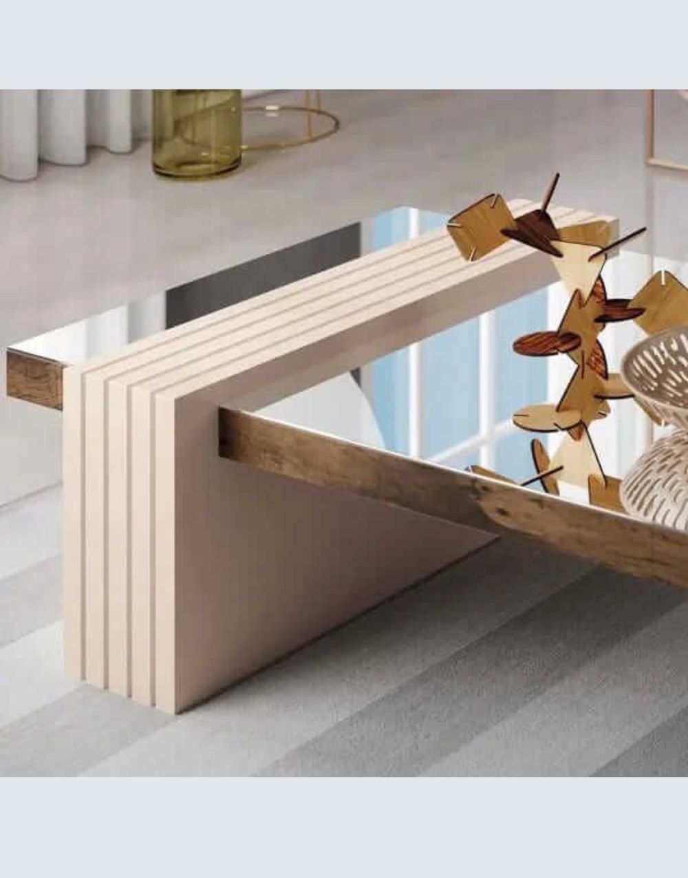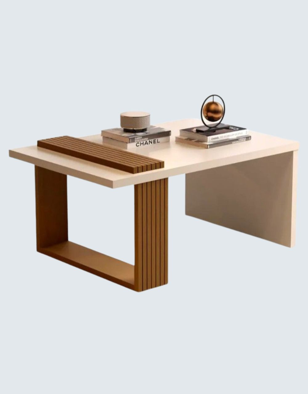 La mesa de centro exhibe un diseño distintivo que fusiona madera maciza de flor morado alistonada con una base blanca de madera industrializada, recubierta en poliuretano blanco semi-brillante, generando un efecto visual armonioso. Su versatilidad y funcionalidad la hacen idónea para diversos propósitos, aportando estilo y durabilidad a cualquier ambiente doméstico.