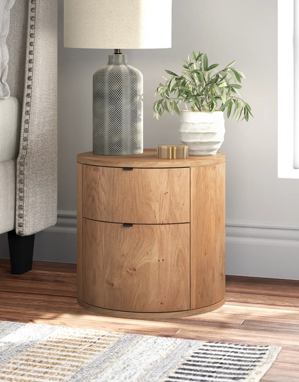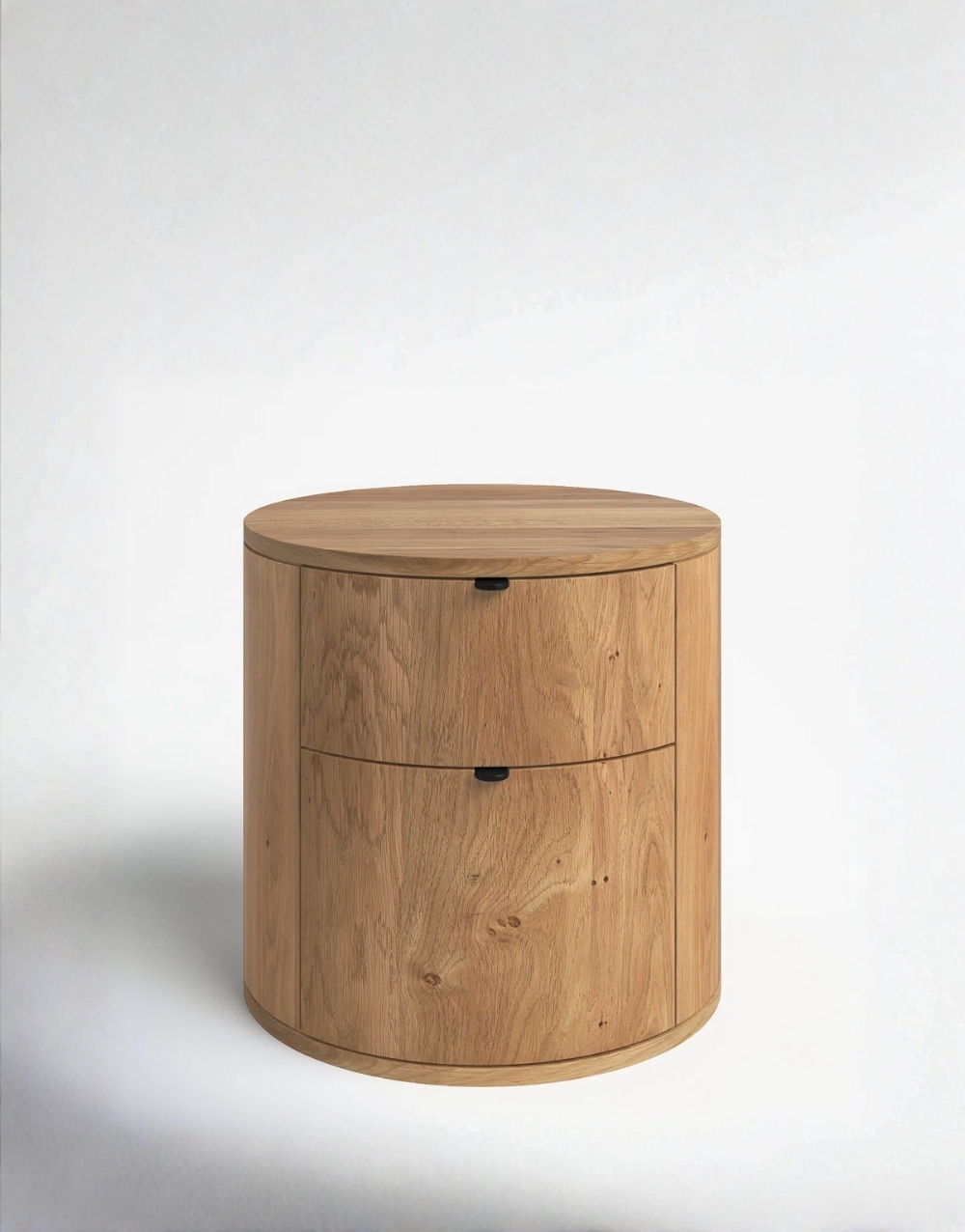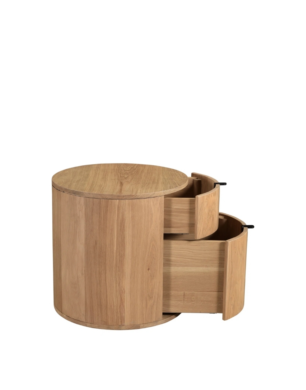 Mesa de noche de diseño contemporáneo con estructura cilíndrica fabricada en madera industrializada con recubirimiento natural chapilla roble catedral de vetas visibles y pronunciadas; incluye dos cajones frontales con manija minimalista, logrando una pieza compacta, funcional y estéticamente limpia, ideal para ambientes modernos y cálidos.