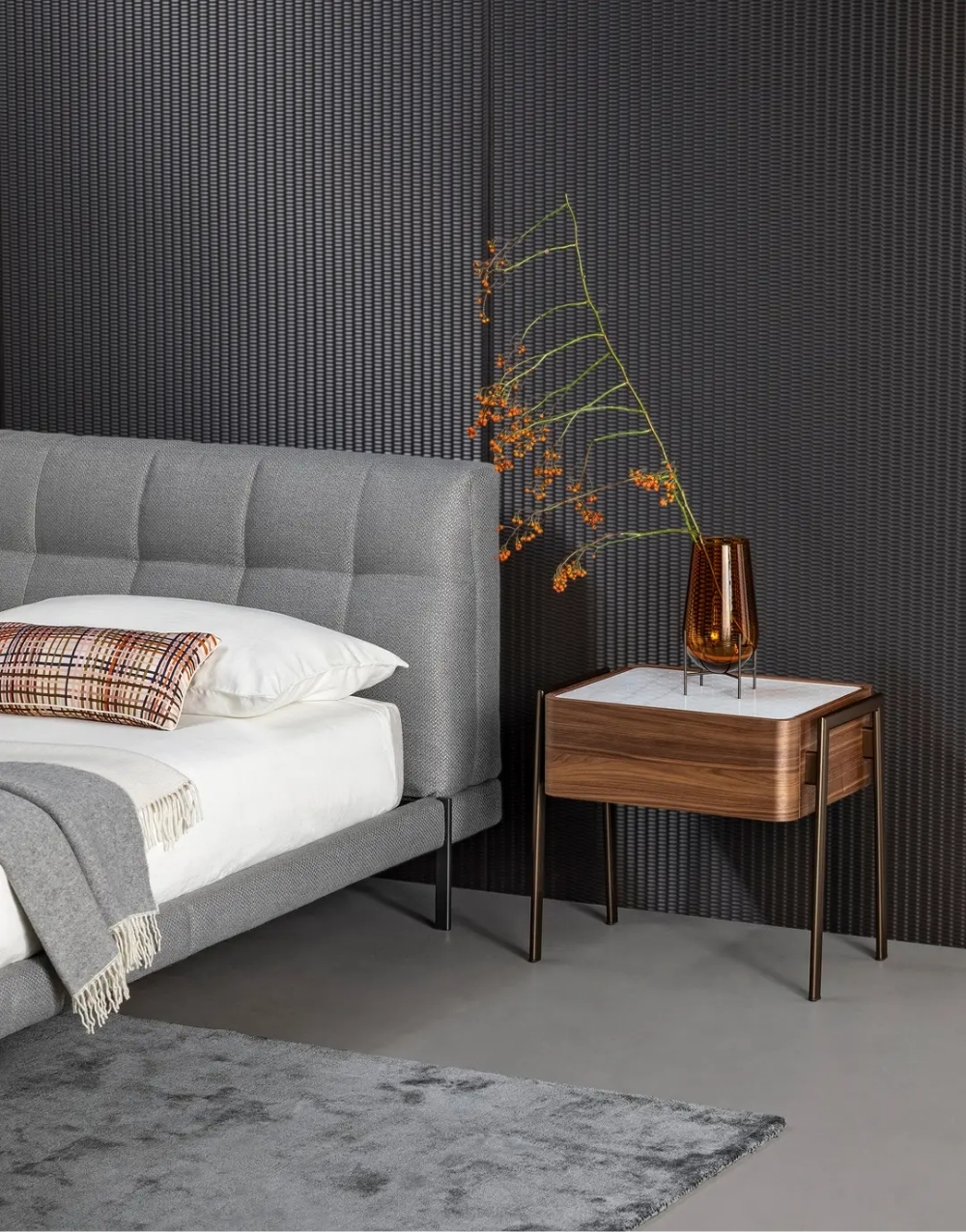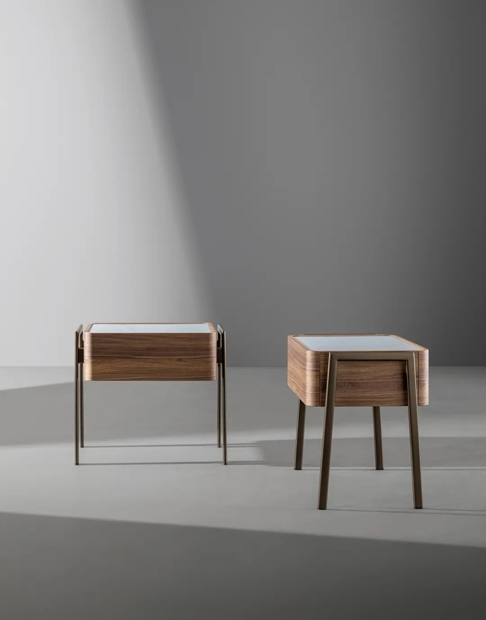 Esta mesa de noche combina materiales nobles con un diseño minimalista y preciso. El cuerpo está construido en madera maciza con vetas visibles y esquinas suavemente redondeadas, lo que aporta una estética cálida y sofisticada. La tapa superior en piedra sinterizada con vetas sutiles, enmarcada por un borde de madera que realza el contraste visual. La estructura se sostiene sobre un juego de patas metálicas esbeltas y geometría angular, que se integran lateralmente al volumen principal mediante uniones discretas y bien resueltas. El conjunto transmite solidez, ligereza visual y un alto nivel de detalle técnico.