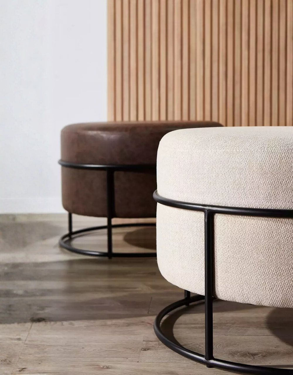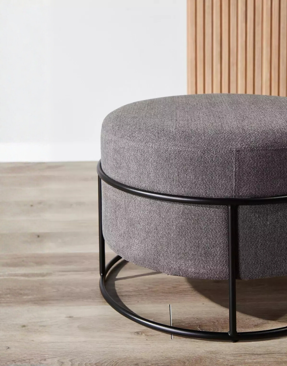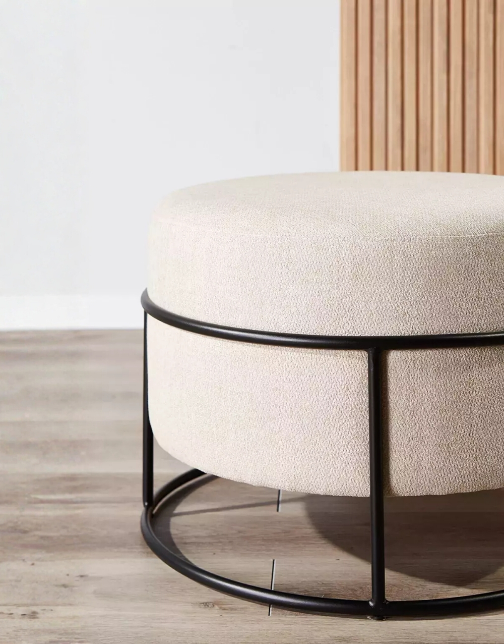 Puff redondo de estilo moderno, compuesto por un asiento tapizado de textura suave y una estructura metálica tubular en acabado personalizable que forma un aro inferior y soportes verticales minimalistas; su diseño equilibrado combina comodidad y estética contemporánea, ideal como asiento auxiliar o elemento decorativo.
