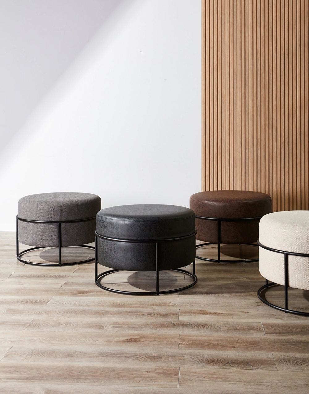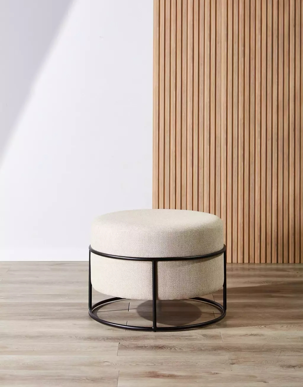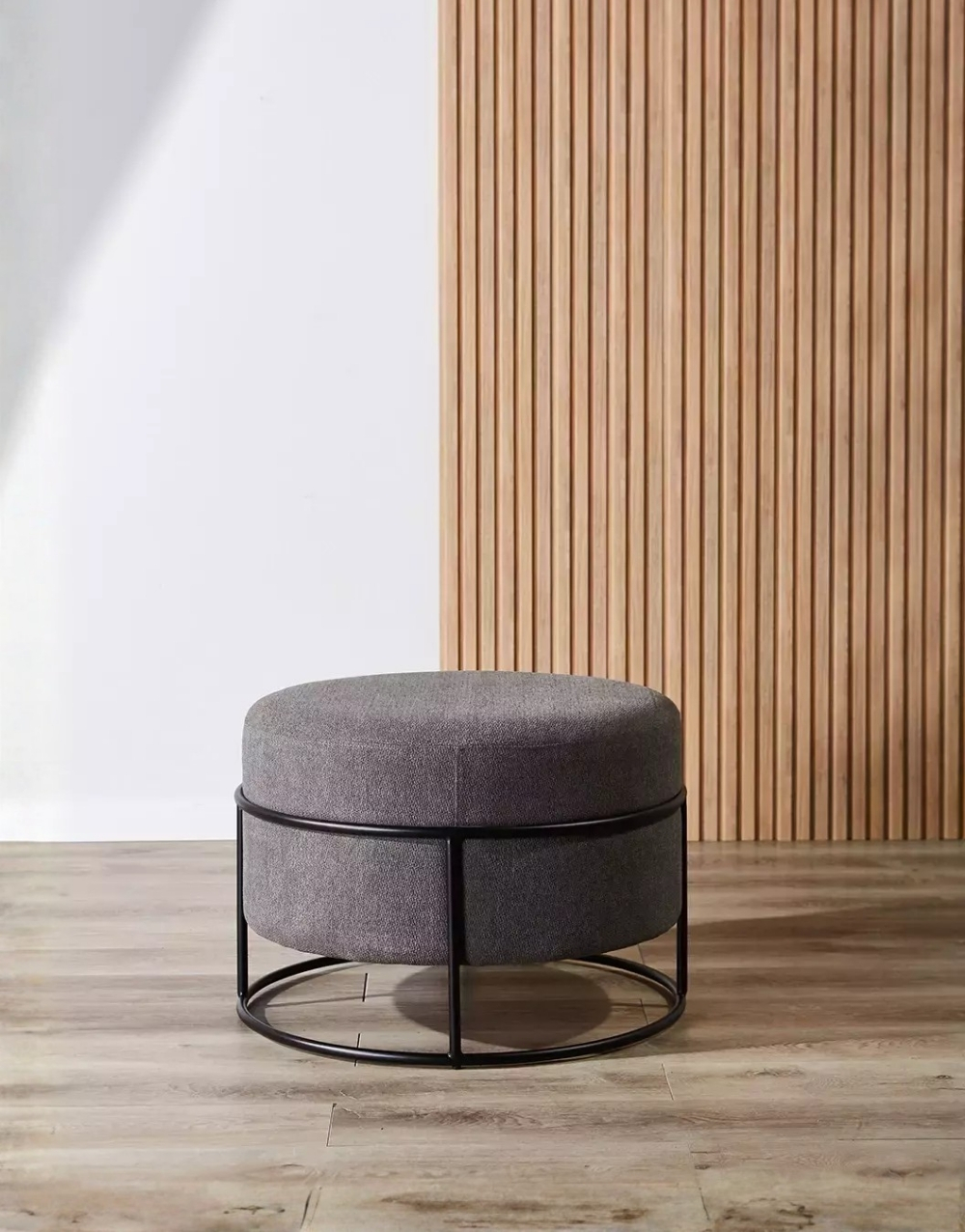 Puff redondo de estilo moderno, compuesto por un asiento tapizado de textura suave y una estructura metálica tubular en acabado personalizable que forma un aro inferior y soportes verticales minimalistas; su diseño equilibrado combina comodidad y estética contemporánea, ideal como asiento auxiliar o elemento decorativo.