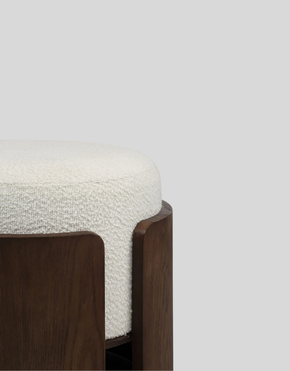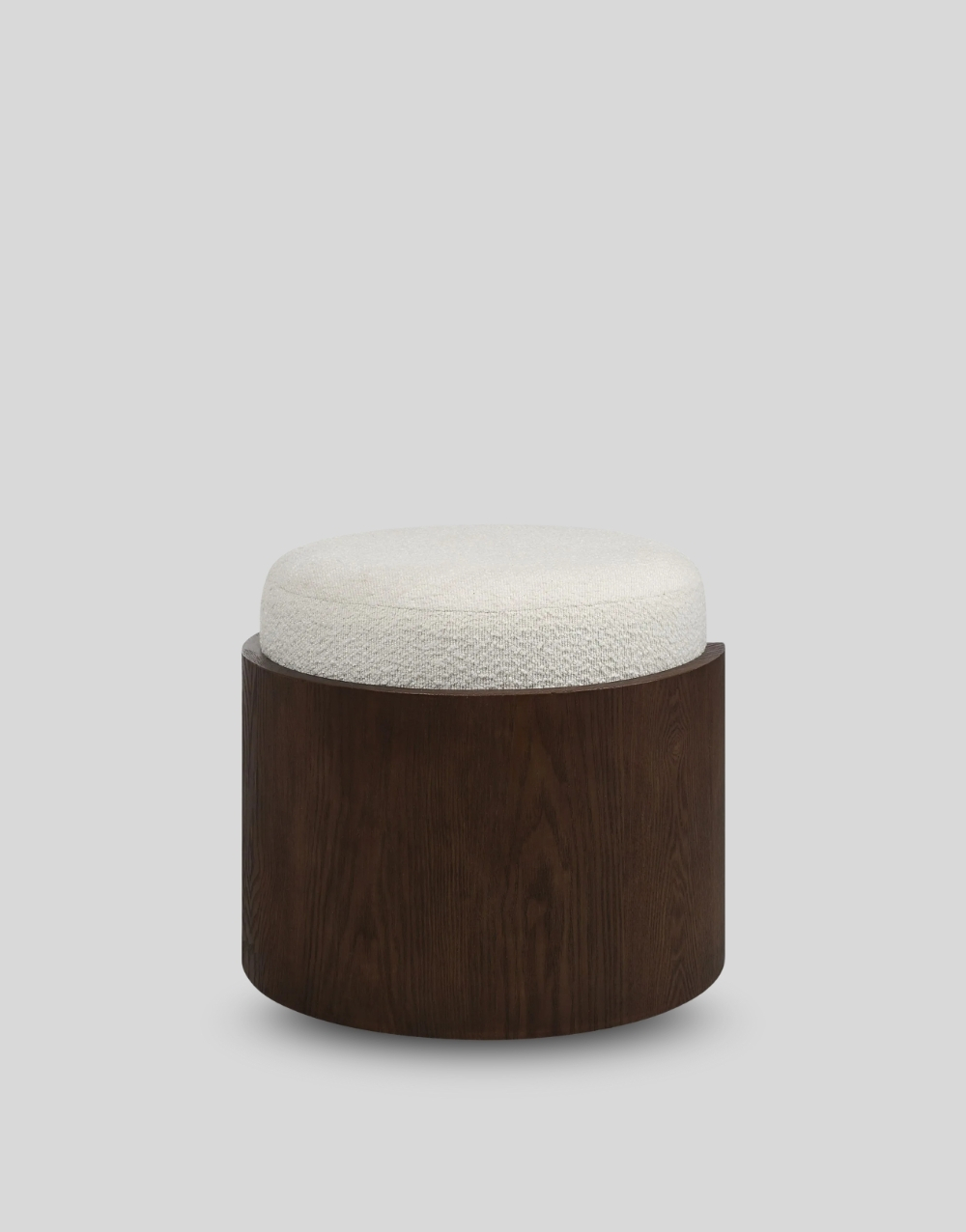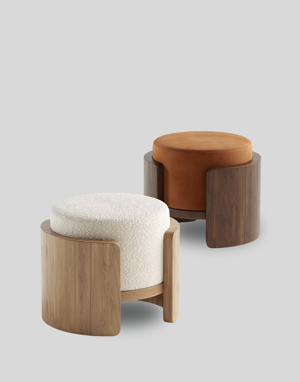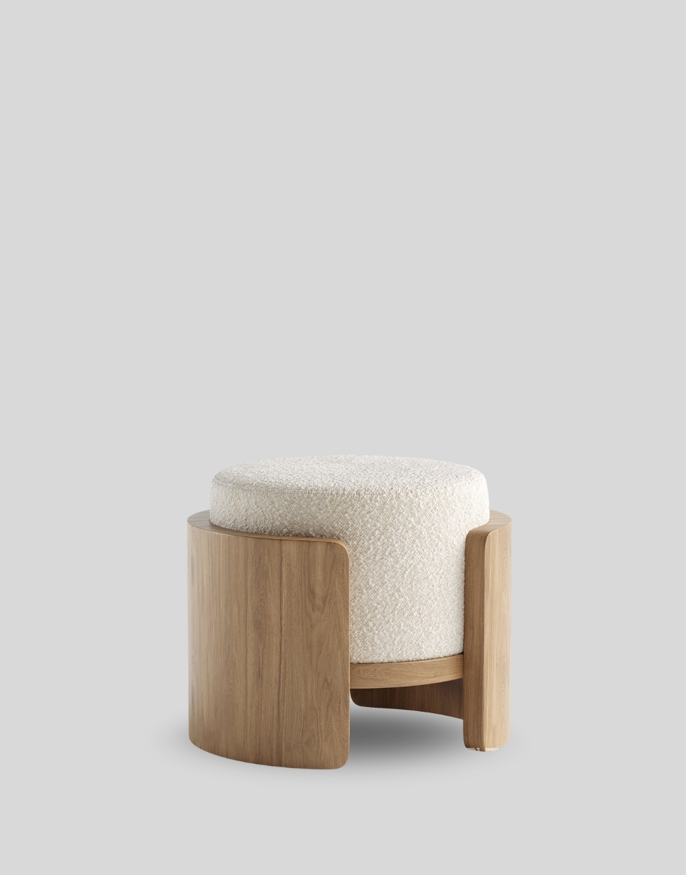 Este puff cuenta con una base envolvente de paneles curvos en madera, formando una estructura semicilíndrica sólida que abraza el asiento. El cojín superior es redondo y voluminoso tapizado, aportando confort y un aspecto cálido. La base elevada permite ver un refuerzo interno también en madera, garantizando estabilidad y durabilidad. Su diseño combina líneas suaves con un carácter escultórico, ideal para interiores contemporáneos y de inspiración natural.