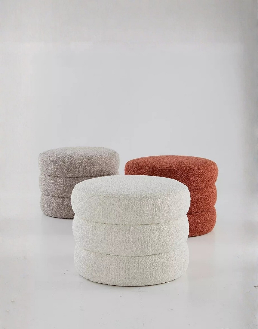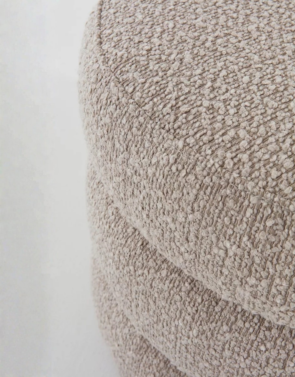Este puff de forma cilíndrica está compuesto por tres secciones apiladas visualmente, generando un volumen segmentado y simétrico. Está tapizado en un tejido que aporta un acabado cálido y táctil. Con núcleo estructural en madera maciza, con relleno de espuma de alta densidad para mantener la forma redondeada y ofrecer un soporte estable. El diseño, sin patas visibles, proporciona una estética minimalista y monolítica, ideal para interiores contemporáneos o espacios que buscan un asiento decorativo y cómodo.