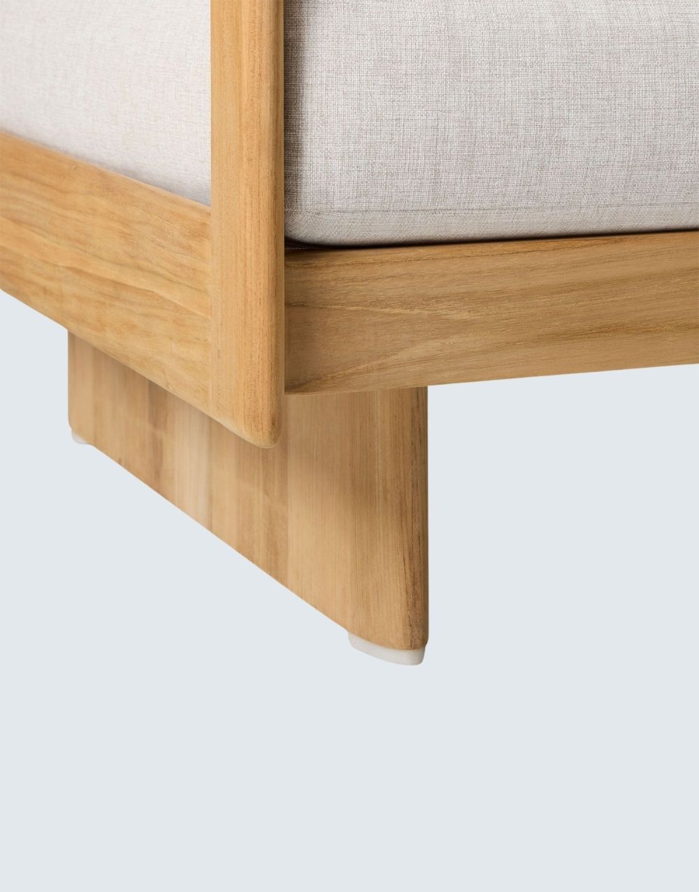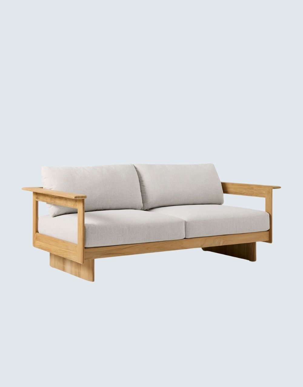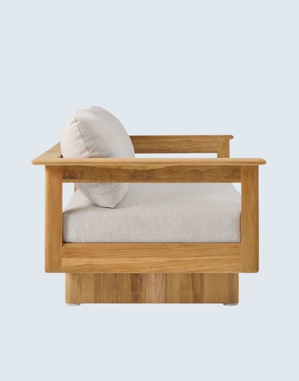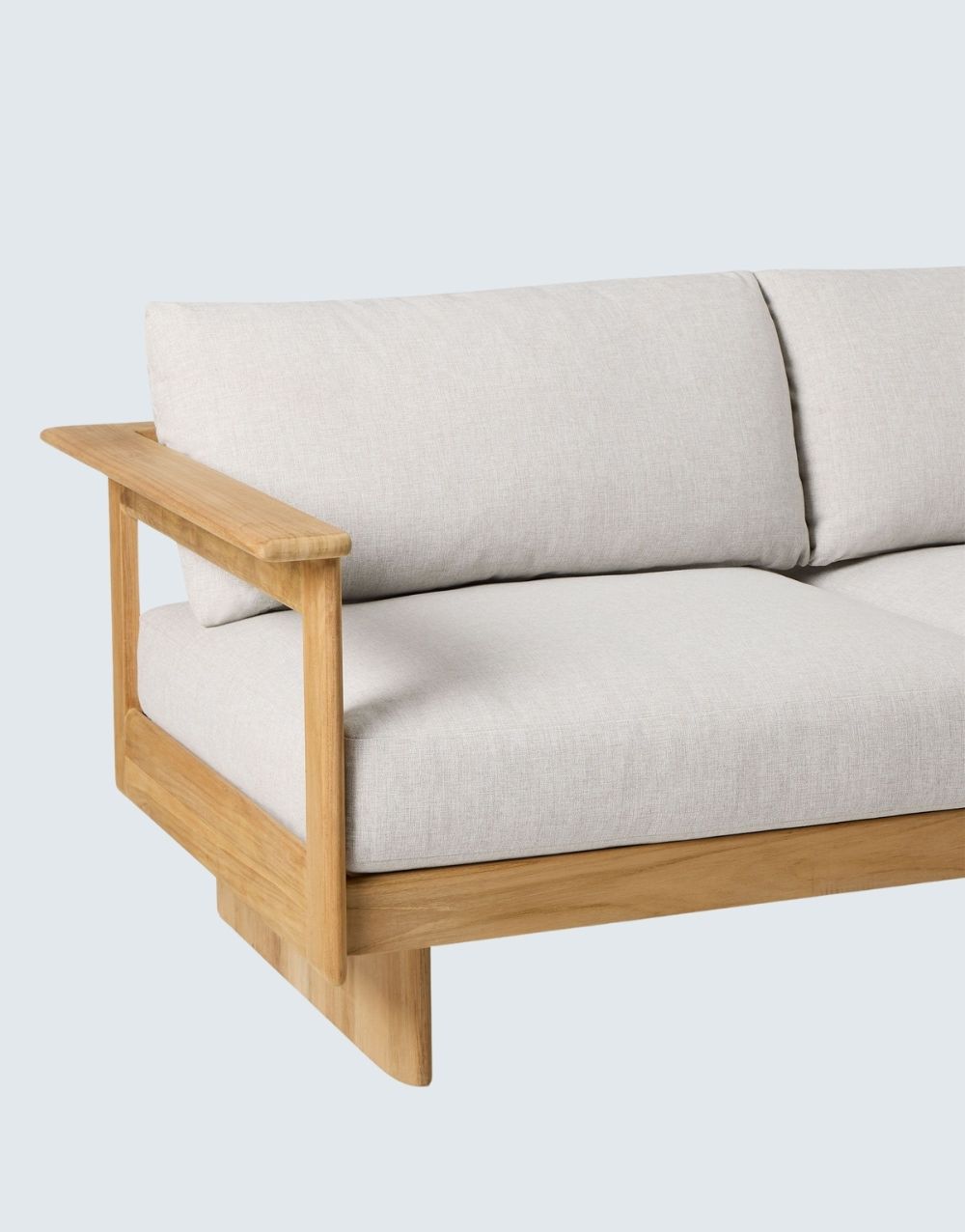 El sofá de exterior BONNET en madera de TECA, presenta un diseño moderno con líneas limpias y un marco finamente labrado a mano en madera maciza natural para exteriores, resaltando la belleza de la veta de la madera. Su versatilidad y elegancia lo convierten en una opción encantadora que complementa cualquier ambiente. Tela de alta duración en exterior.